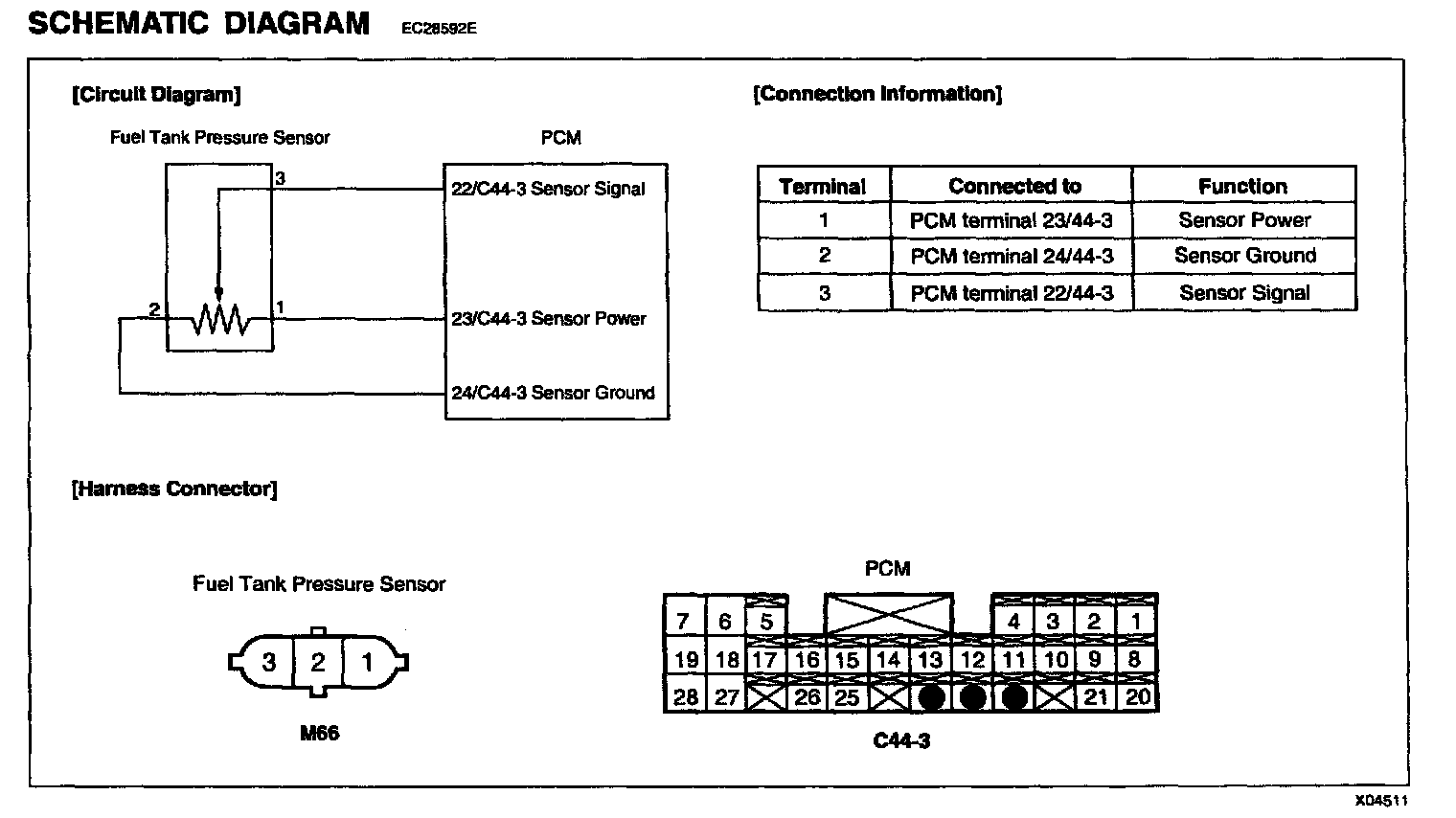 The evaporative emission control system prevents hydrocarbon vapors from escaping from the fuel tank into the atmosphere where they could form photochemical smog. Gasoline vapors are collected in the charcoal canister. The Fuel Tank Pressure Sensor (FTPS) is an integral part of the evaporative monitoring system. The PCM monitors the FTPS signal to detect vacuum decay and excess vacuum. The FTPS measures the difference between the air pressure inside the fuel tank and outside air pressure to check the purge control solenoid valve operation and for leak detection in the evaporative emission control system by monitoring pressure and vacuum levels in the fuel tank during the purge control solenoid valve operating cycles.