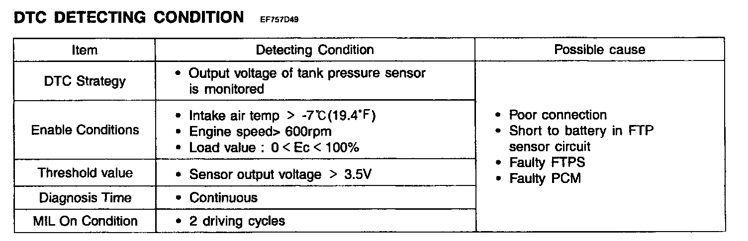 If the sensor output voltage is higher than 3.5 V, the PCM determines that a fault exists and a DTC is stored.