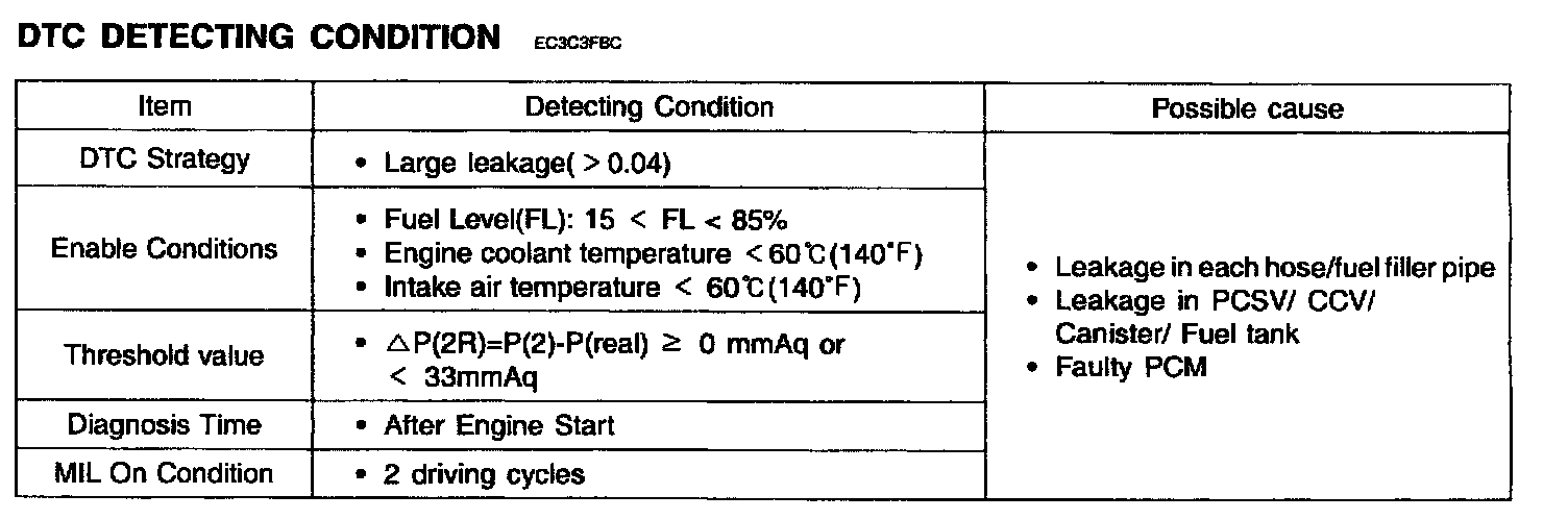 If there is small leak (0.04inch) in system, the PCM determines that a fault exists and a DTC is stored.