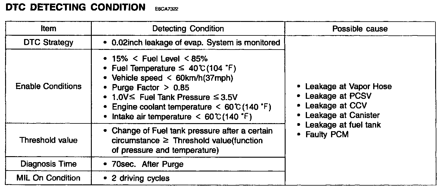 If there is small leak (0.02inch) in system, the PCM determines that a fault exists and a DTC is stored.