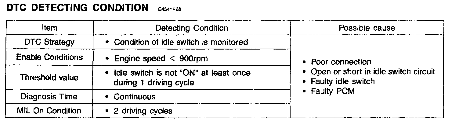 If the idle switch doesn't turn ON during driving cycle, the PCM determines that a fault exists and a DTC is stored.