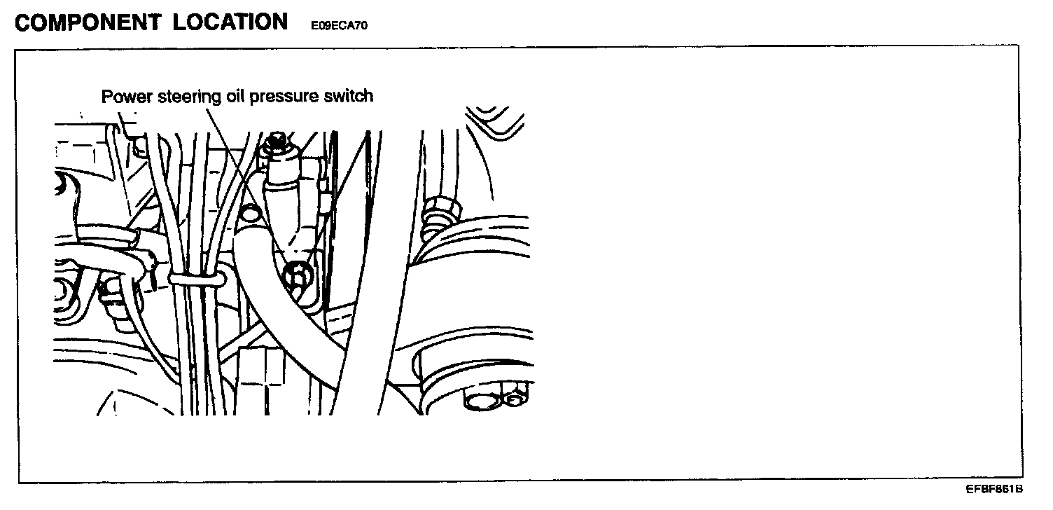 The power steering system increases steering performance and improves steering feel and power-saving effectiveness. The power steering pressure switch senses the power steering load and converts it into a voltage (high/low) signal to the PCM. The PCM then controls the idle speed control motor by using the voltage signal from the power steering pressure switch.