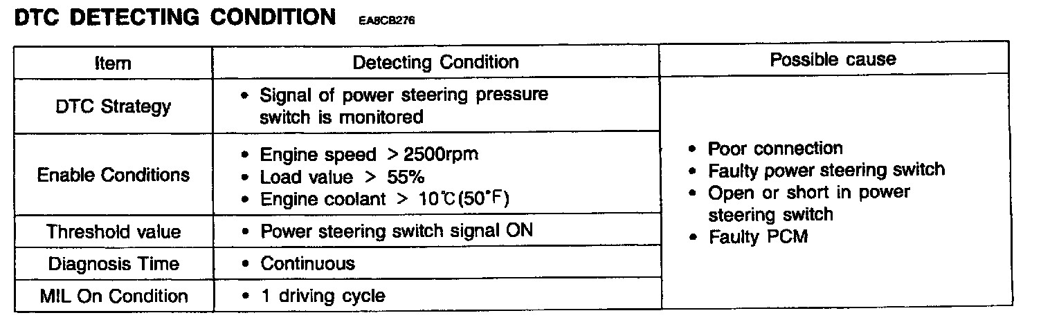 If a power steering pressure switch signal to the PCM is ON when the enable conditions are met, the PCM determines that a fault exists and a DTC is stored.