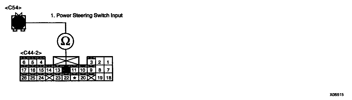 3. Measure resistance between terminal "1" of Power steering pressure switch harness connector and terminal "12/C44-2" of PCM harness connector.