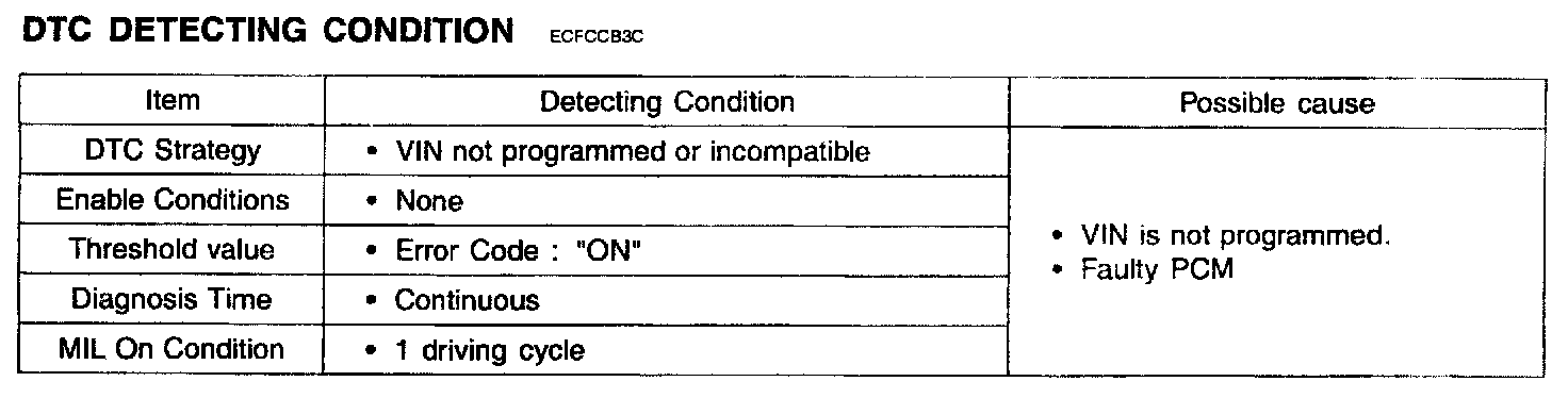If the VIN writing is not programmed or incompatible, the PCM determines that a fault exists and a DTC is stored.