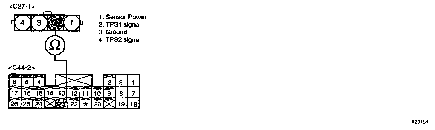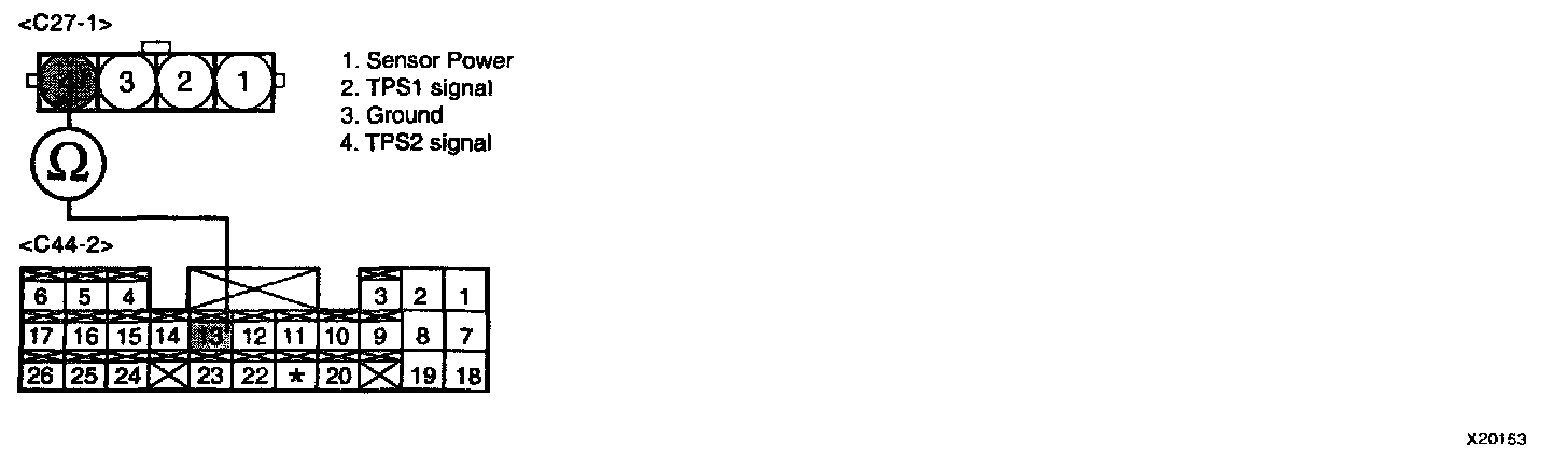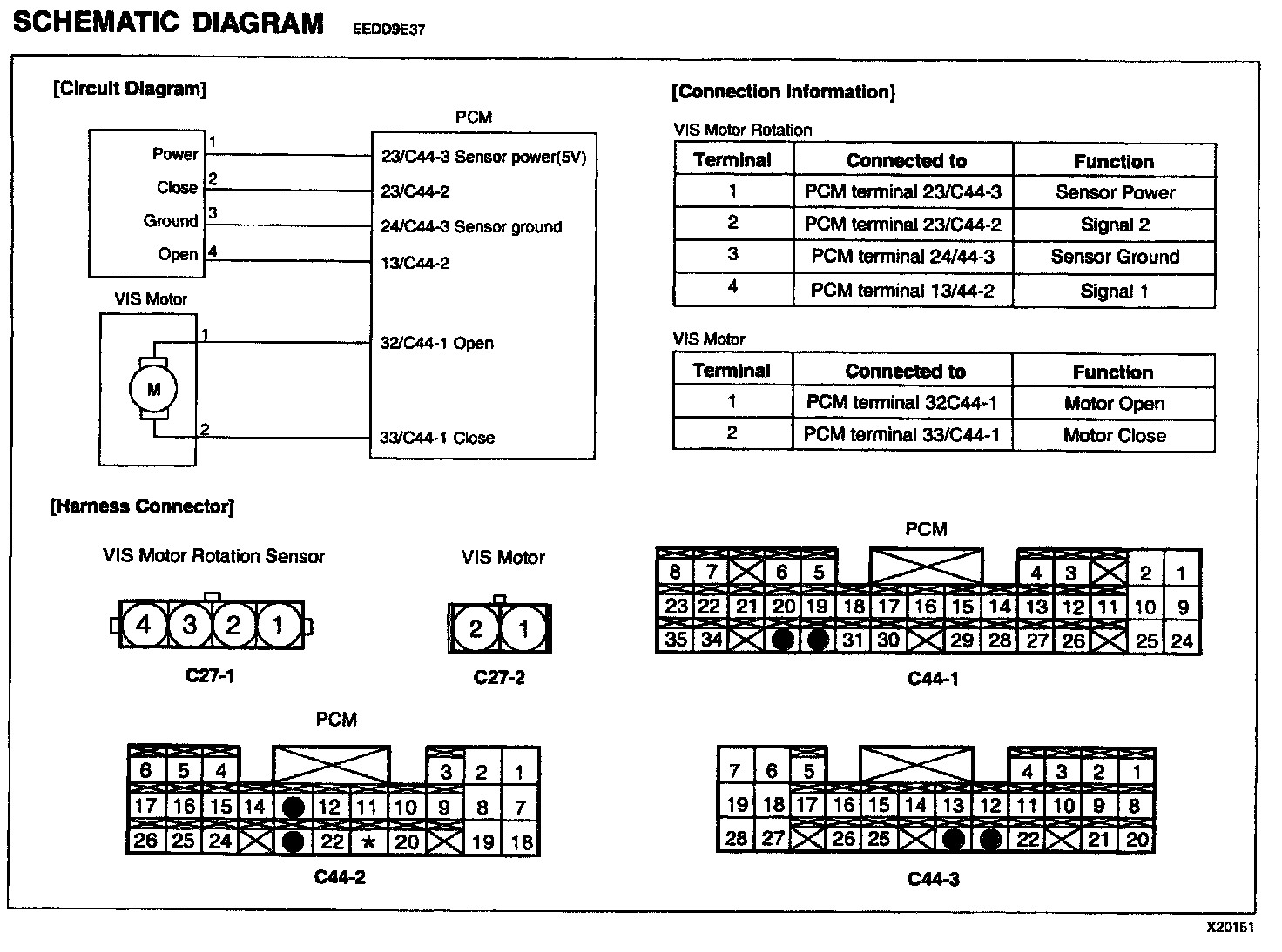 3. Measure resistance between terminal "2" of VIS motor rotation sensor harness connector and "23/C44-2" of PCM harness connector.