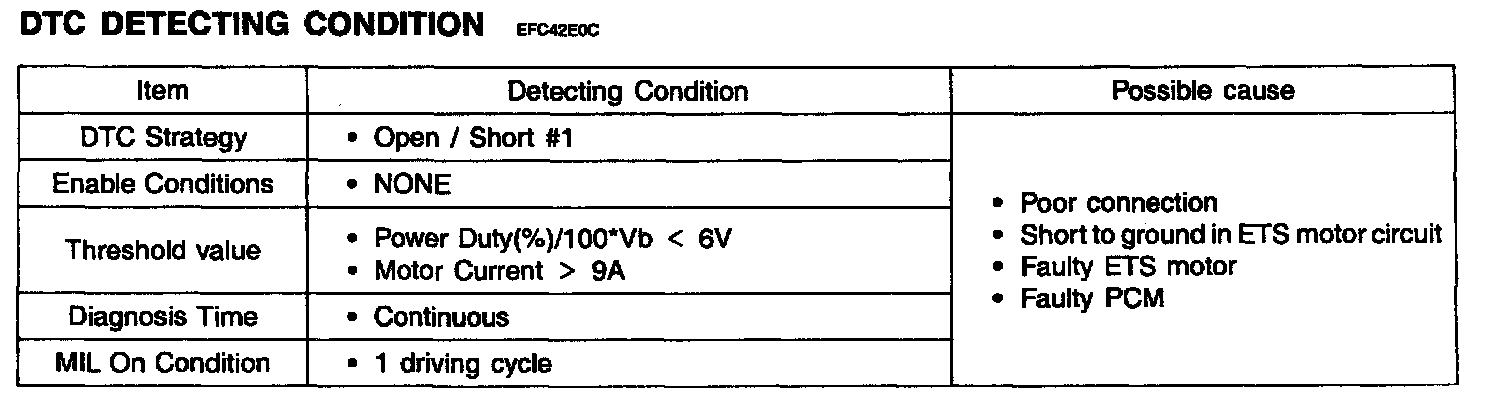 DTC P2102 is set if the output voltage of ETS motor is lower than 6 V or the motor current is higher than 9 A.