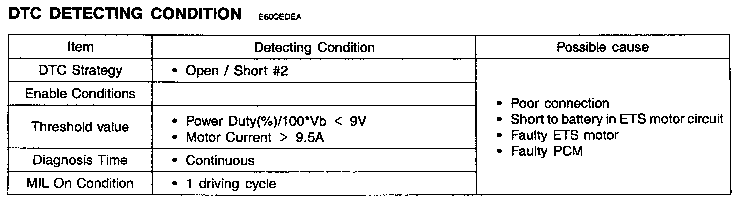 DTC P2103 is set if the calculated value of ETS motor is lower than 9 V and the motor current is higher than 9.5 A.