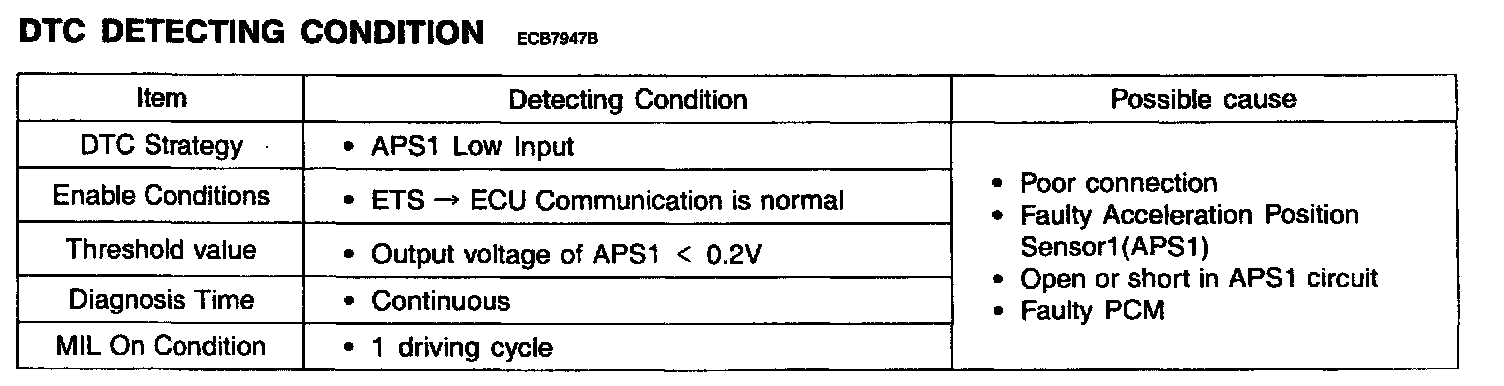 This DTC is set if the signal voltage of acceleration position sensor 1 is lower than threshold value.