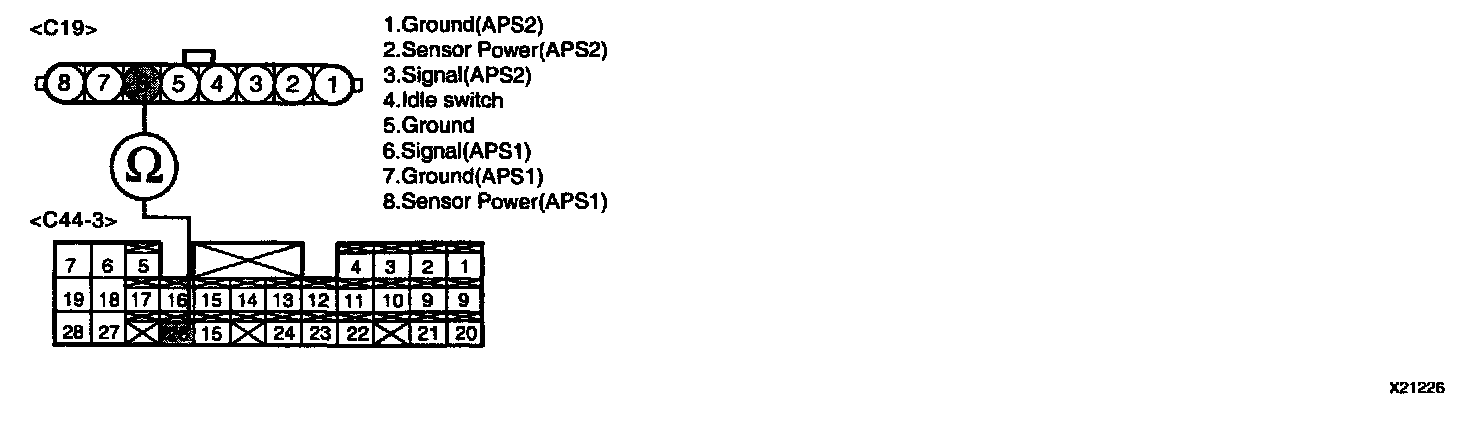 3. Measure resistance between terminal "6" of APS harness connector and "26/C44-3" of PCM harness connector.
