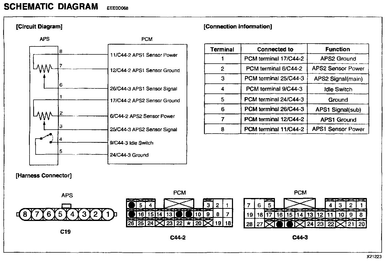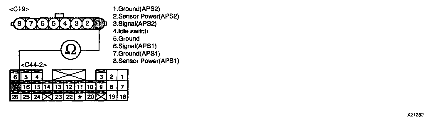 3. Measure resistance between terminal "1" of APS harness connector and "17/C44-2" of PCM harness connector.