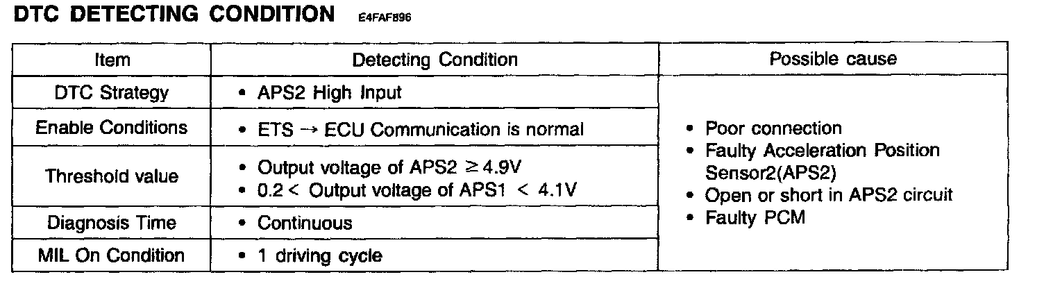 This DTC is set if the signal voltage of acceleration position sensor 2 is higher than threshold value.