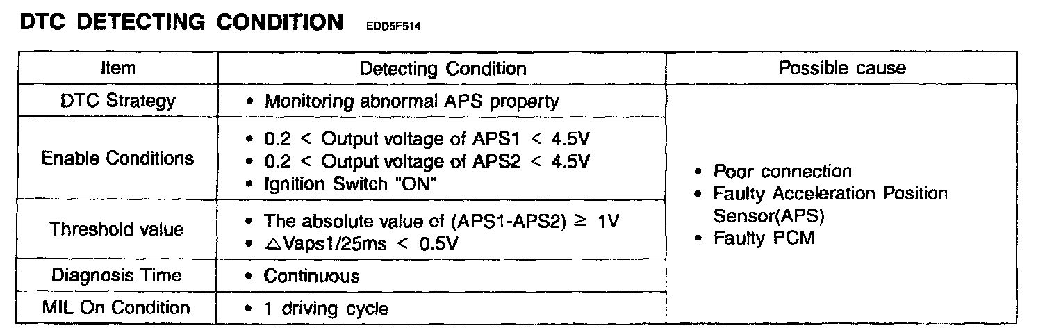 This DTC is set if the difference between the output voltage of APS1 and that of APS2 is higher than 1 V.