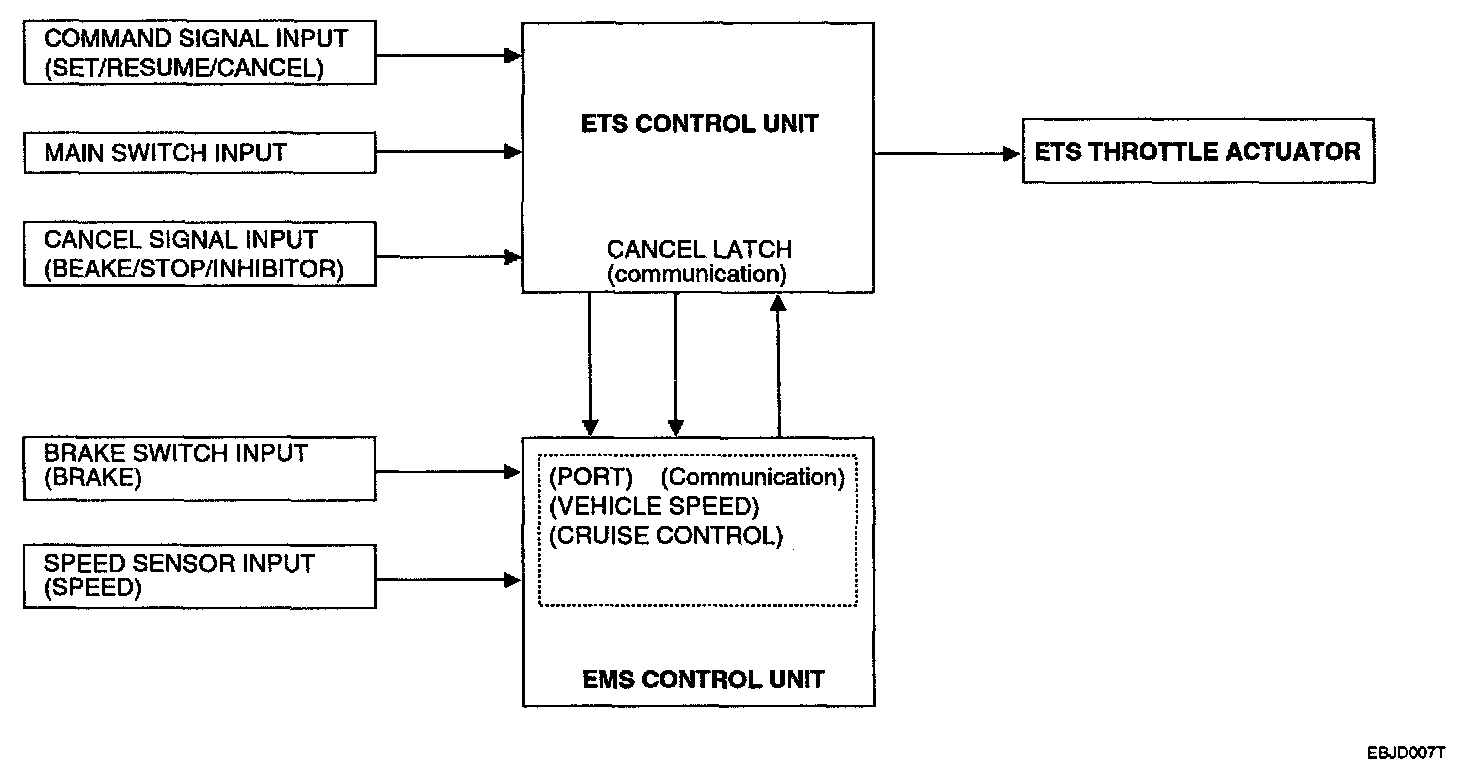 The auto cruise control has built-in ETS. (Electronic Throttle System) ETS control module and ECM(Engine Control Module) receive sensor signal input (for instance, command switch signal, brake switch signal, speed sensor signal, etc.) and control the operation of the ETS throttle actuator.