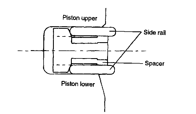 2. Install the upper side rail. To install the side rail, first put one end of the side rail between the piston ring groove and spacer, hold it firmly, and press down with finger on the portion to be inserted into the groove (as illustrated).