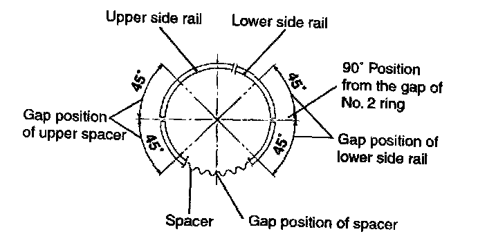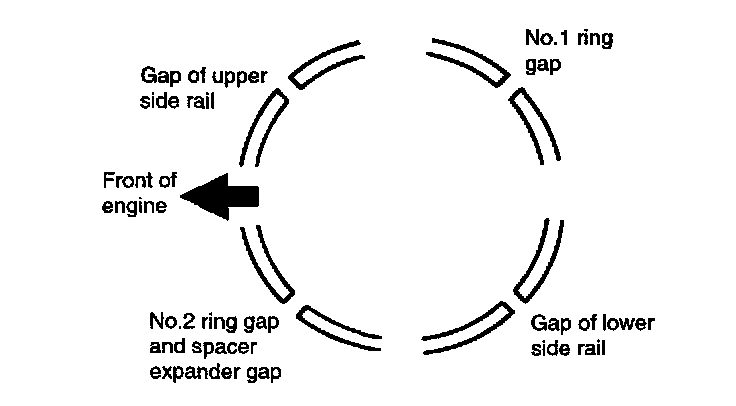 7. Position each piston ring end gap as far away from its neighboring gaps as possible. Make sure that the gaps are not positioned in the thrust and pin directions.