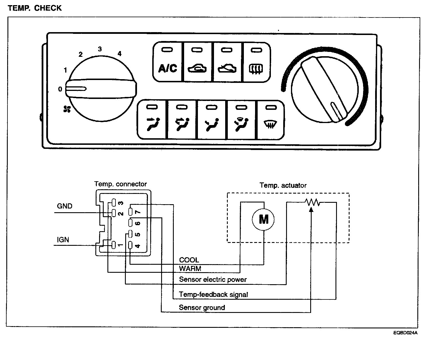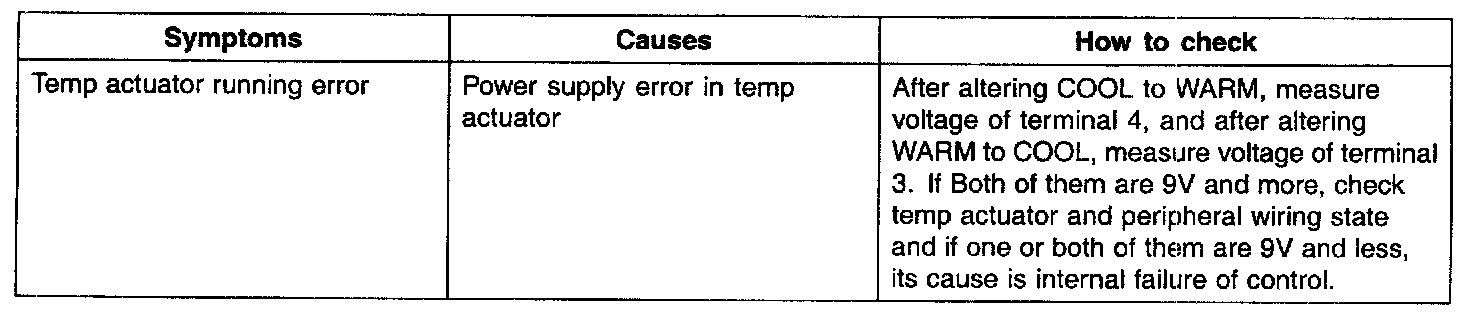 As shown in the figure, in adjusting temp. switch from WARM to COOL, 12 V is outputted from temp. connector terminal 4, 0 V is supplied for terminal 3 and temp. motor works in direction of COOL. In adjusting temp. switch from COOL to WARM, 12 V is outputted from temp. connector terminal 3, 0 V is supplied for terminal 4 and temp. motor works in direction of WARM. When temp. actuator has to move to a certain location for its automatic control, temp. feedback signal terminal moves equally in temp. actuator and informs controller of location of temp. actuator through temp. connector terminal 6. Comparing original value with the inputted value, it works until they are same.