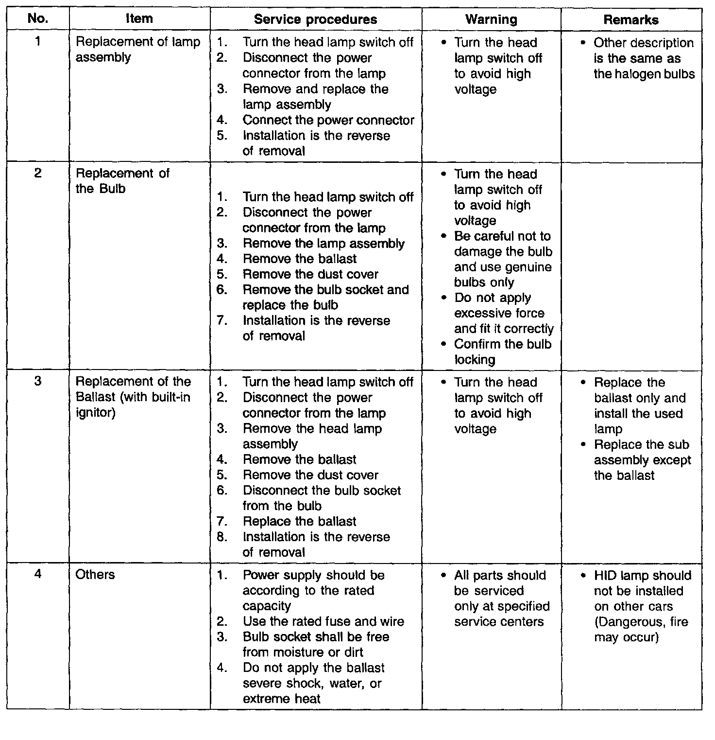 2. Fire may occur when HID lamp initially lights due to the fact that arc-discharge generates high voltage (max. 20,000 V) and high current (12-13 A), and are different from the halogen lamp specification.