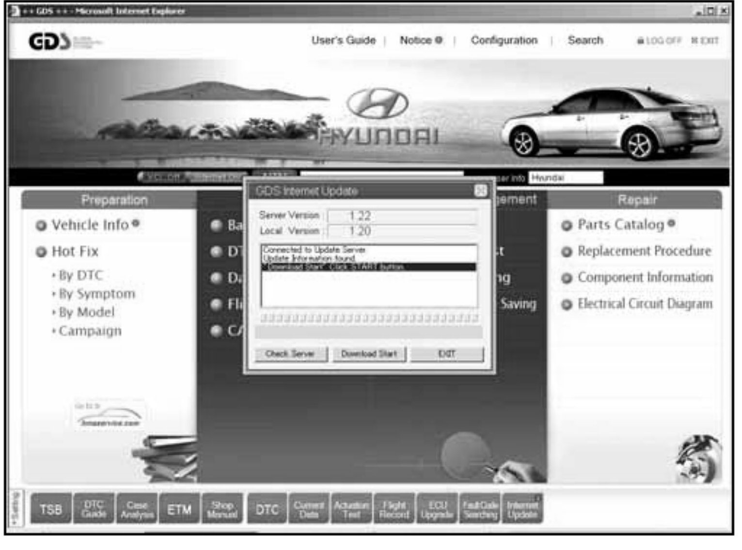 Select the Internet Update to check that your GDS has Local Version 1.22 or higher. Shown is an example of an Internet Update available to Server Version 1.22 with the current GDS Local Version at 1.20, note the Download Start button is available to perform the internet update: