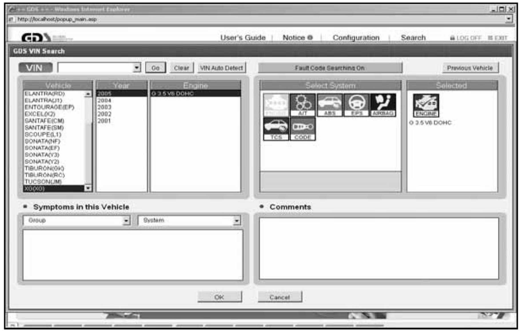 1. Enter the vehicle information either automatically by pressing the VIN Auto Detect button or, if this does not work, manually enter the vehicle model and model year, and select ENGINE as the system: