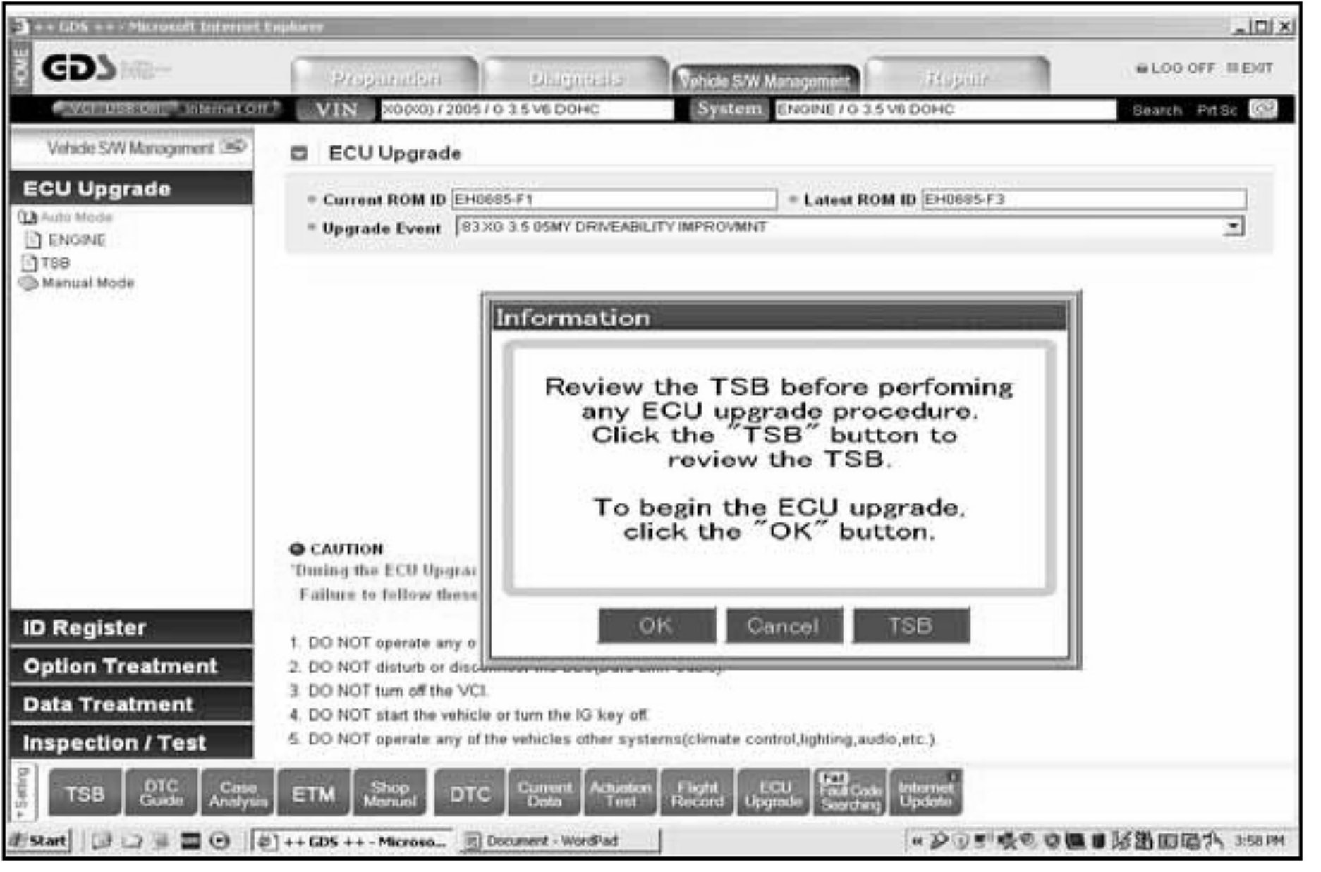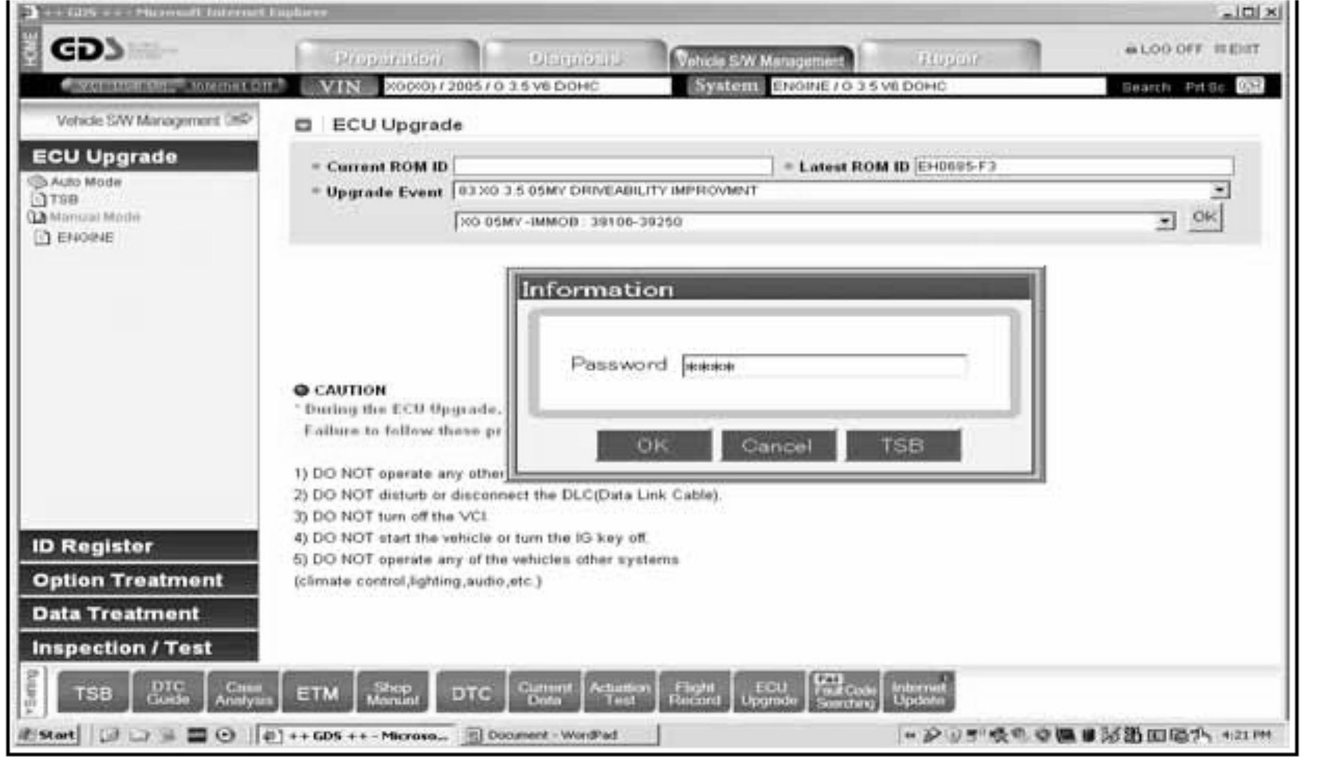 3. Select Auto Mode then ENGINE at the left ECU Upgrade column and the screen shown will be displayed.