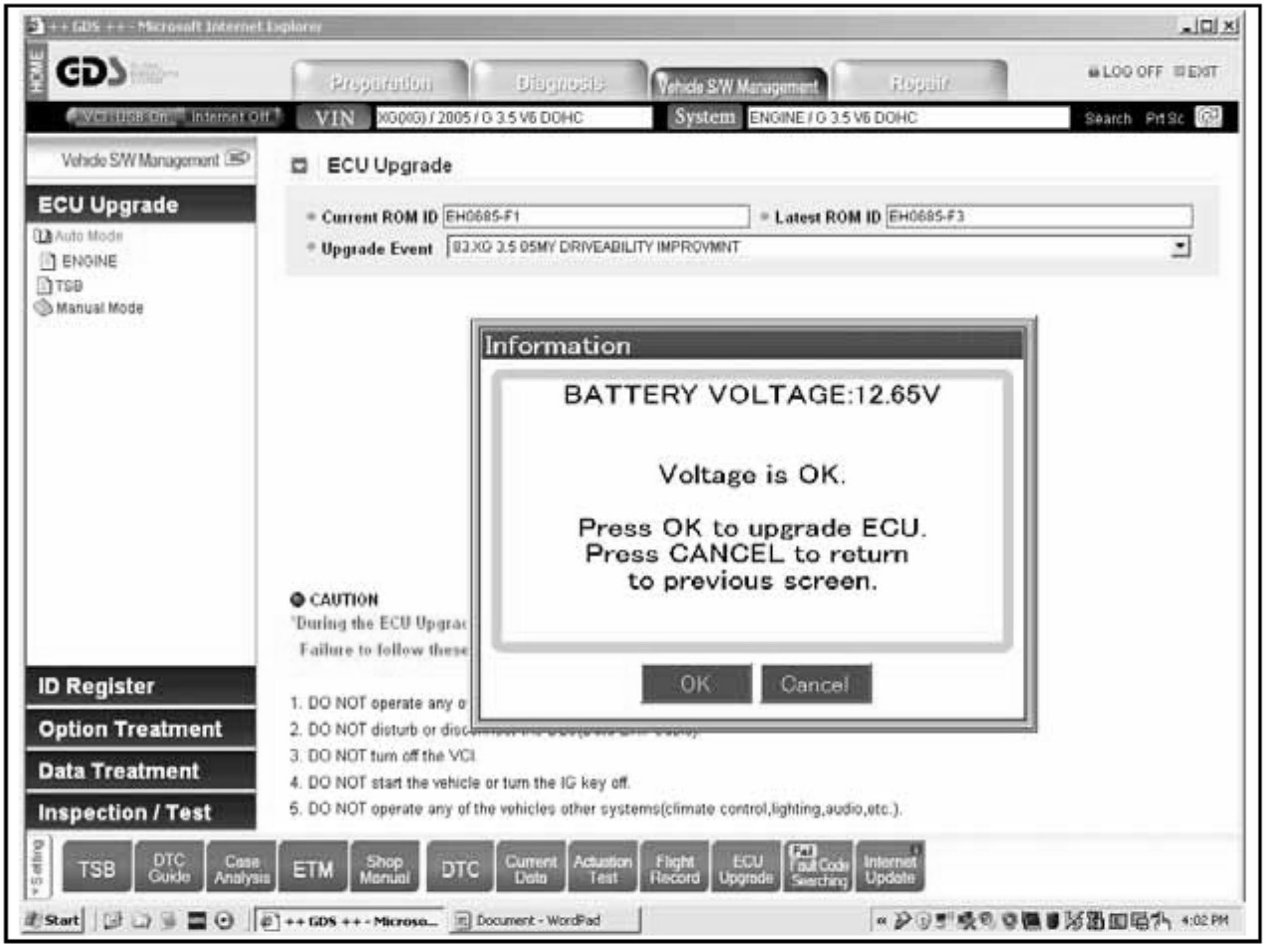3. The battery voltage must be above 12 volts for reliable reprogram results. If the result is good, select OK; otherwise select cancel and run the engine at idle for 10 minutes to recharge battery and retry.