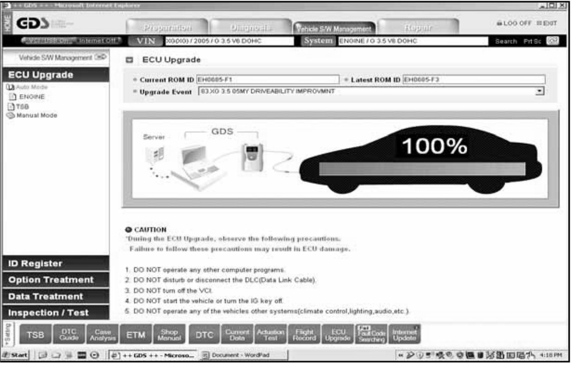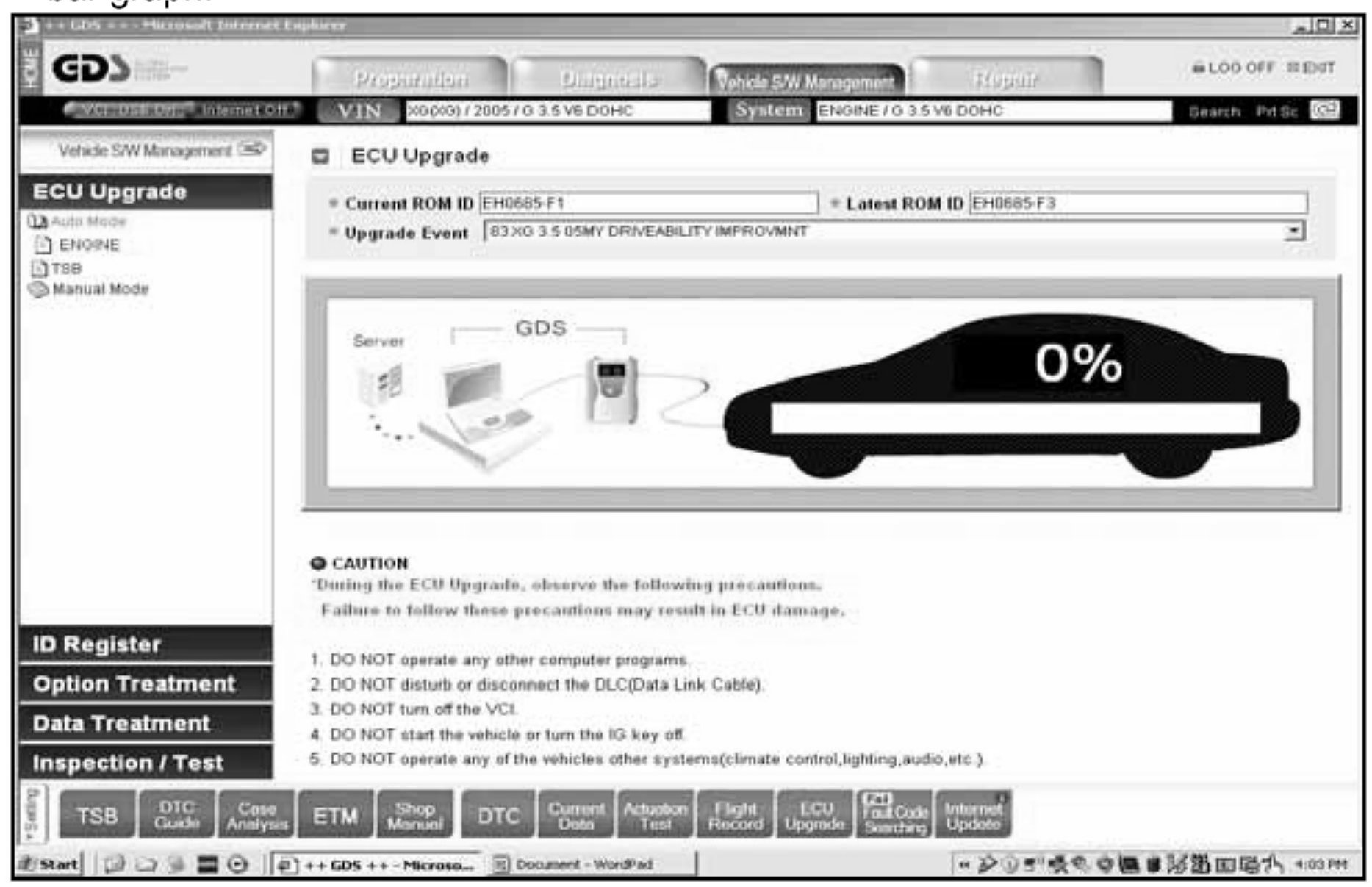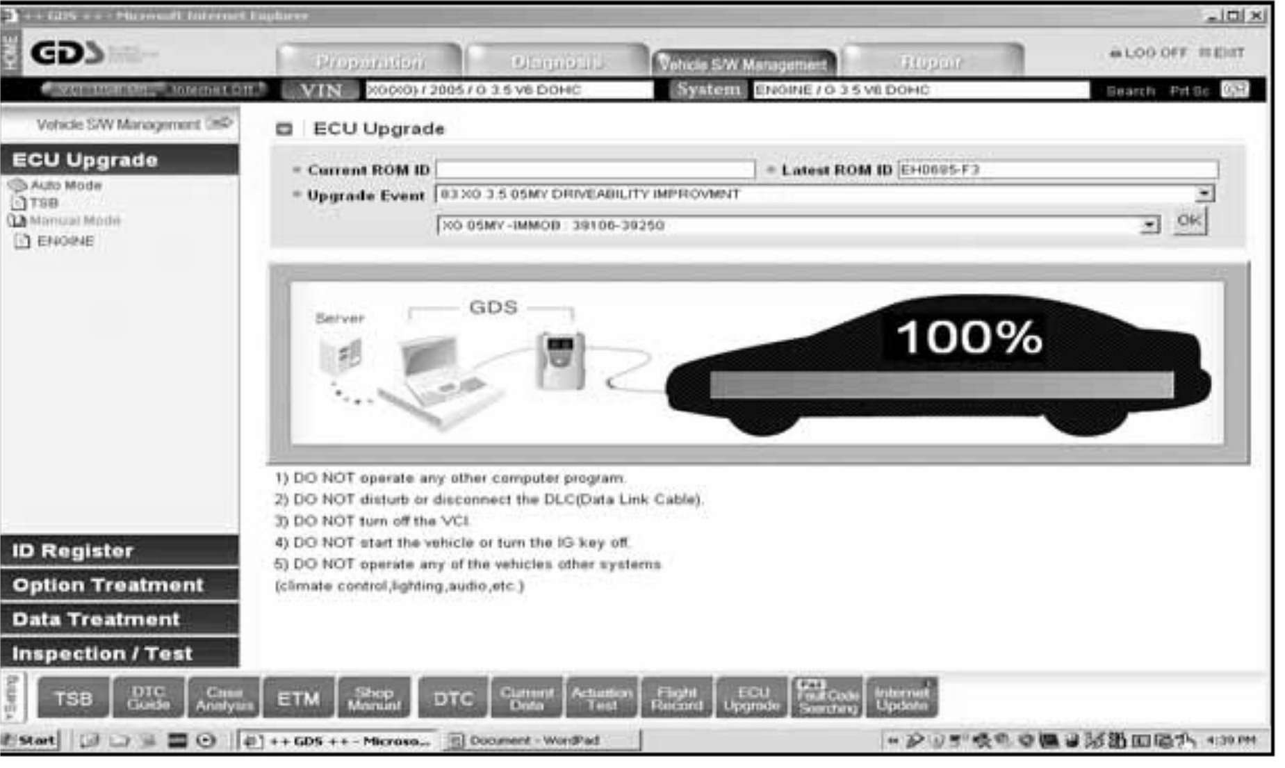 4. Be careful not to disconnect any cables connected to the vehicle, the GDS or the laptop during reprogramming.