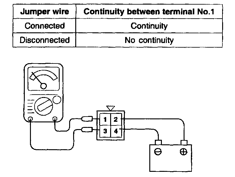 Check the continuity between terminal (1) and terminal (3) of the A/T control relay when the jumper wires are connected to and disconnected from the battery.