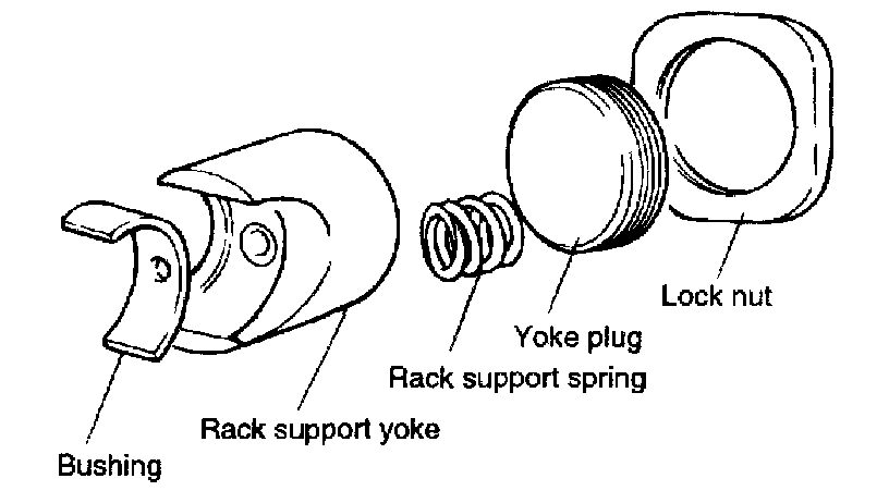 21. Install the bushing, rack support, yoke support spring and rack plug in the order shown. Apply semi-drying sealant to the threaded section of the yoke plug support cover before installation.
