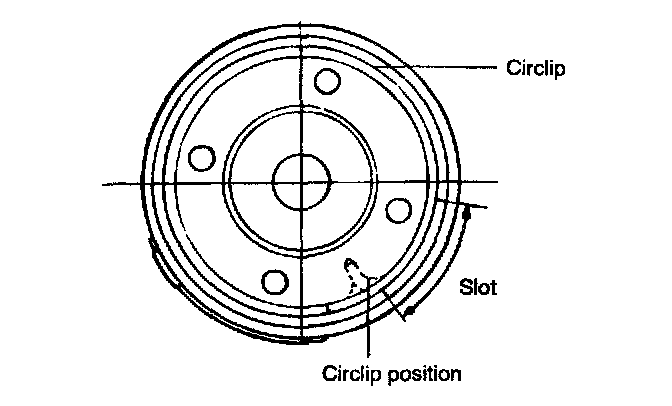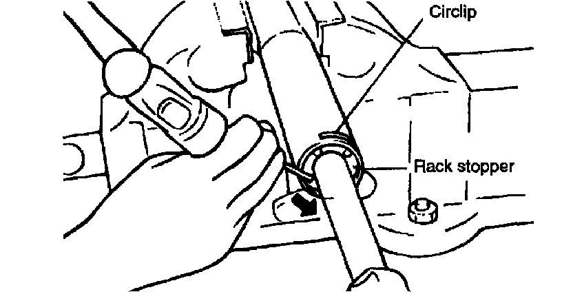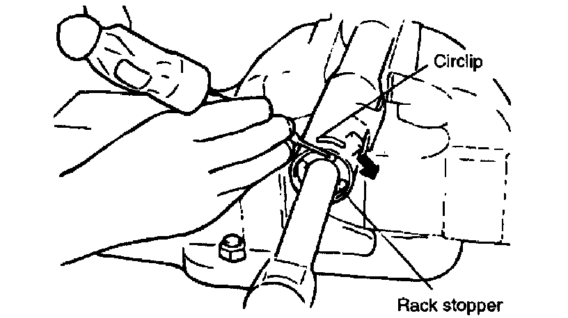 18. When the end of the circlip comes out from the notched hole of the housing rack cylinder, turn the rack stopper counter clockwise and remove the circlip.