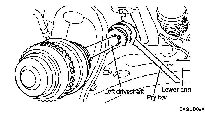 CAUTION: After disconnecting the driveshaft from the axle hub, treat it carefully not to damage the tone wheel on the shaft.