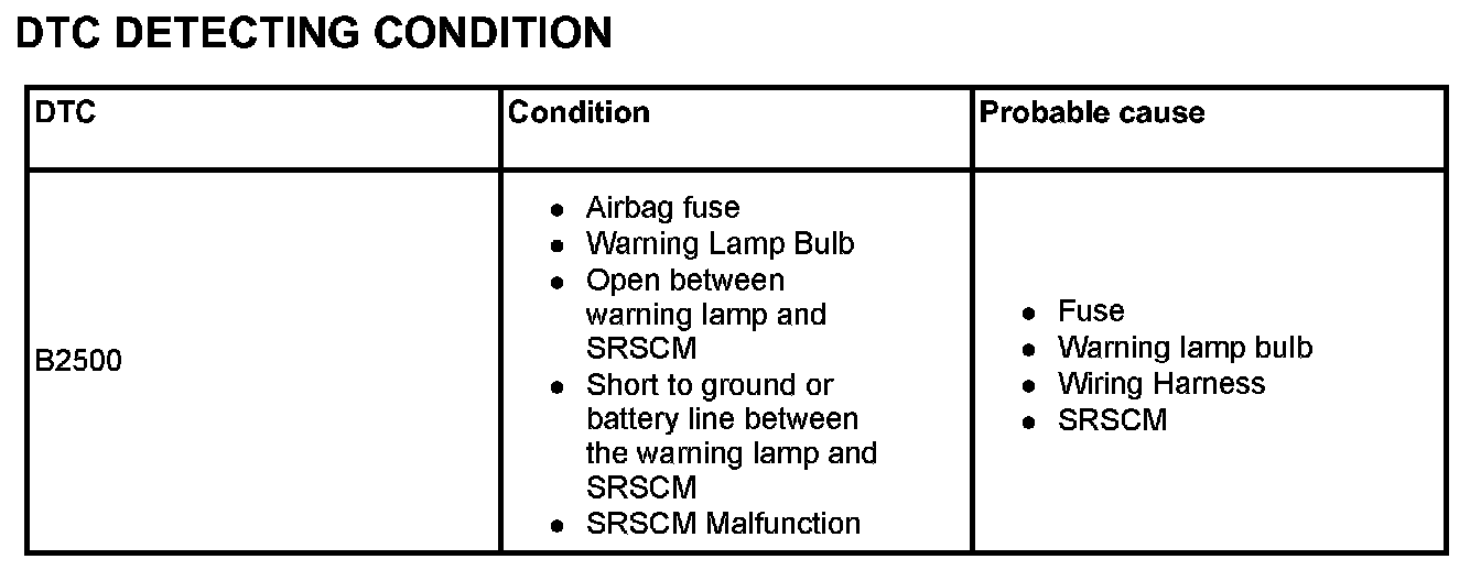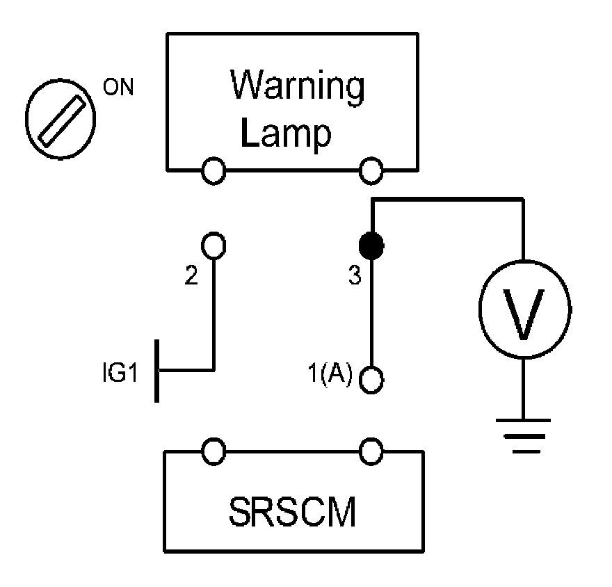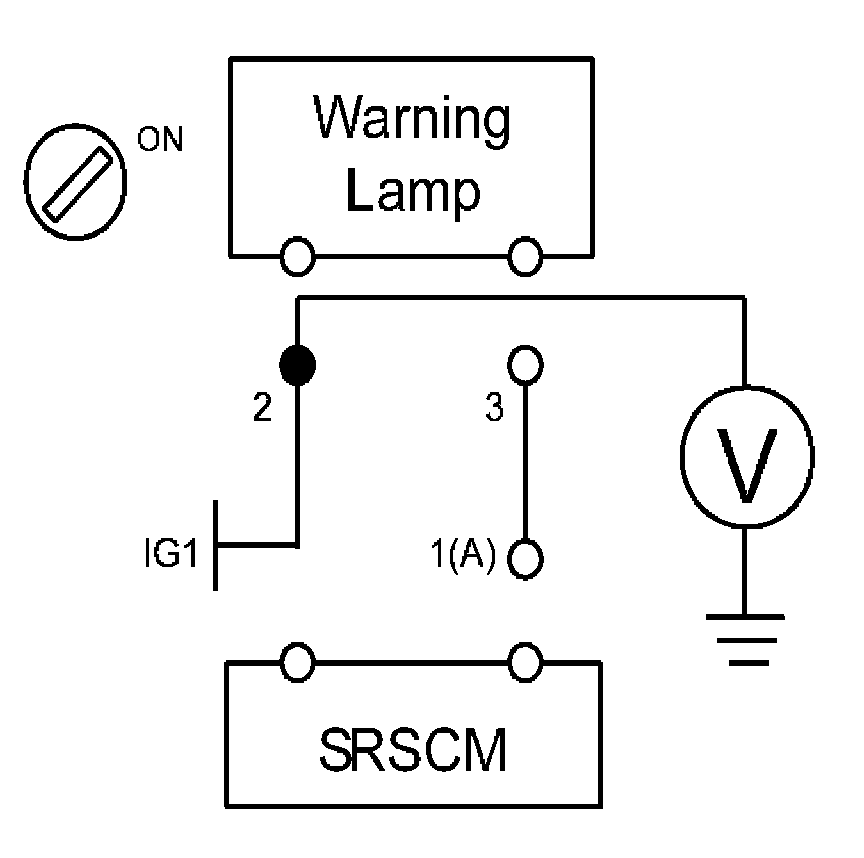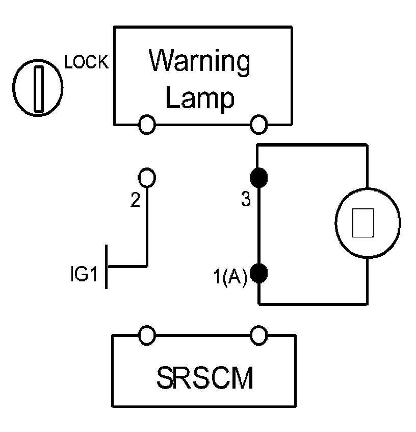 The SRS warning lamp is located in the cluster. When the airbag system is normal, the SRS warning lamp turns on for approx. 6 seconds after the ignition switch is turned to ON, and then turns off automatically. If there is a malfunction in the airbag system, the SRS warning lamp lights up to inform the driver of the abnormality. The SRSCM shall measure the voltage at the SRS warning lamp output pin, both when the lamp is on and when the lamp is off, to detect whether the commanded state matches the actual state.