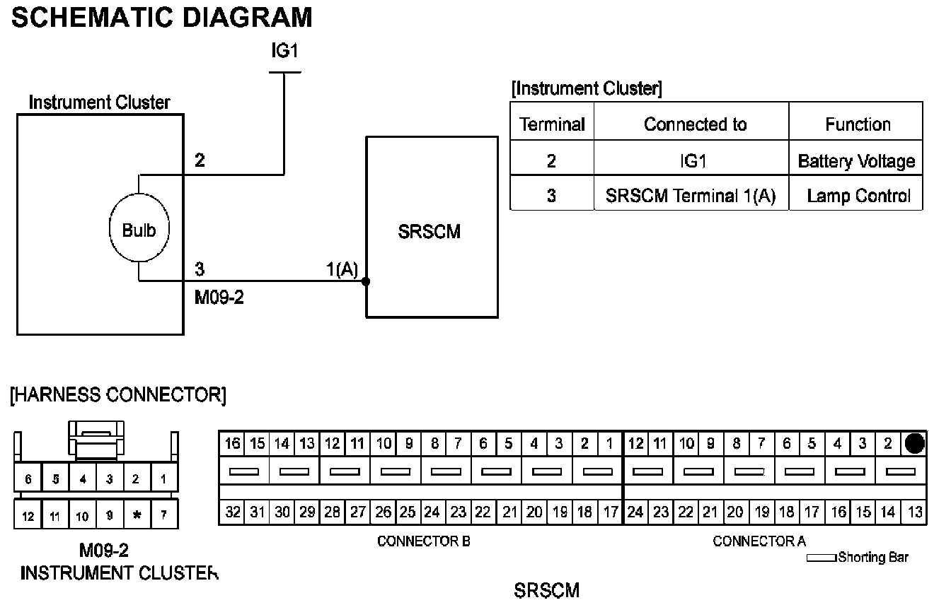 A. Measure resistance between the terminal 3 of the Instrument Cluster connector and the terminal 1 of SRSCM harness connector(A).