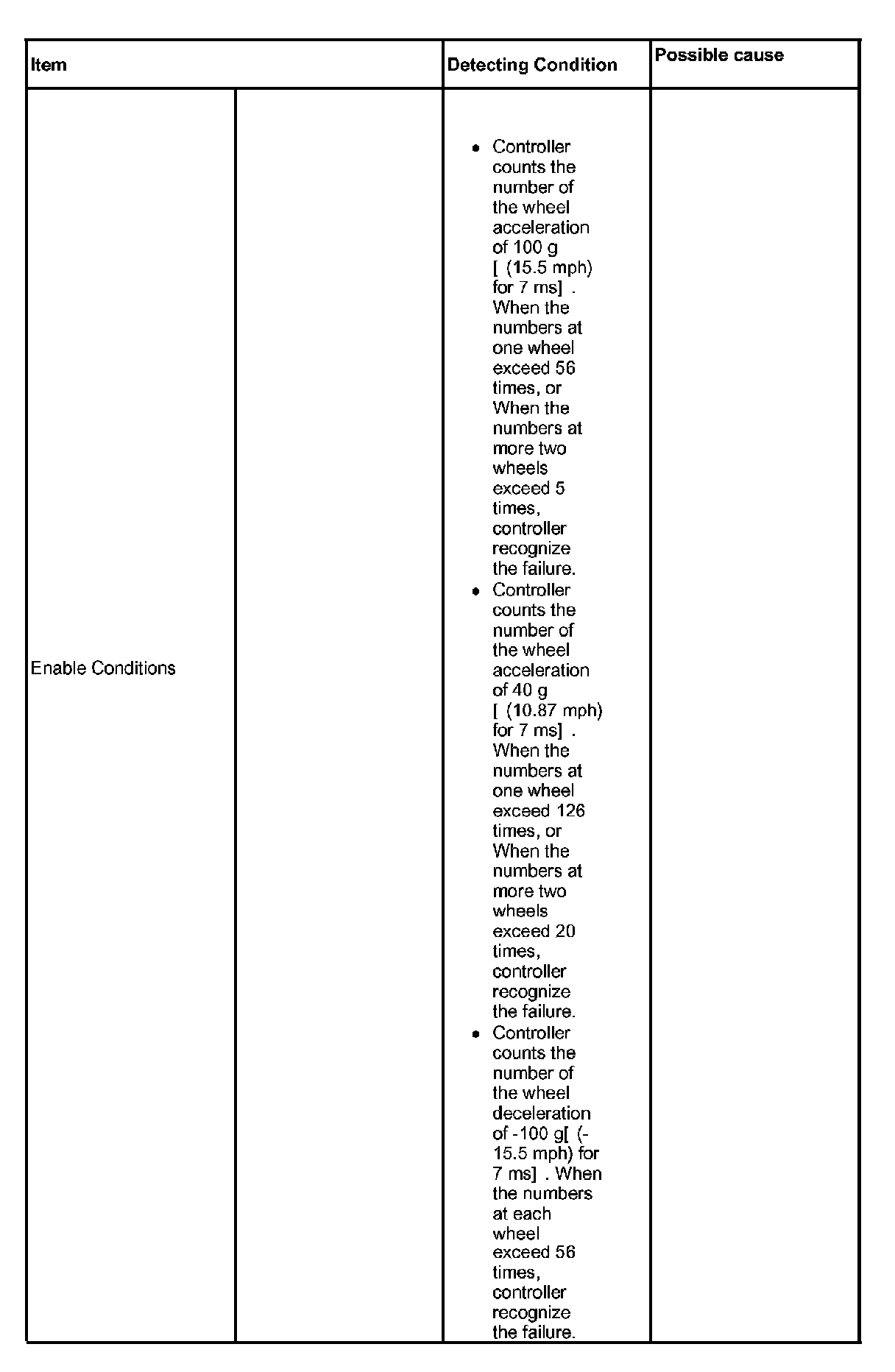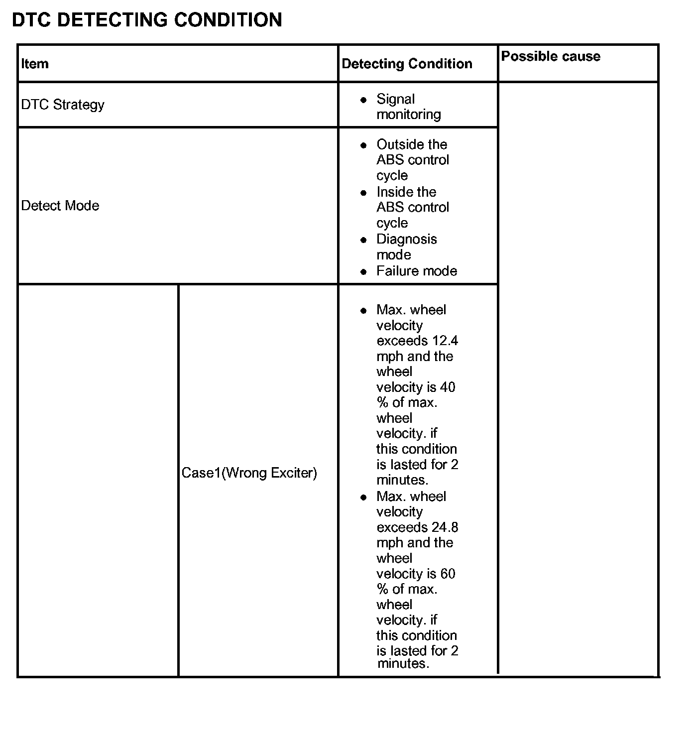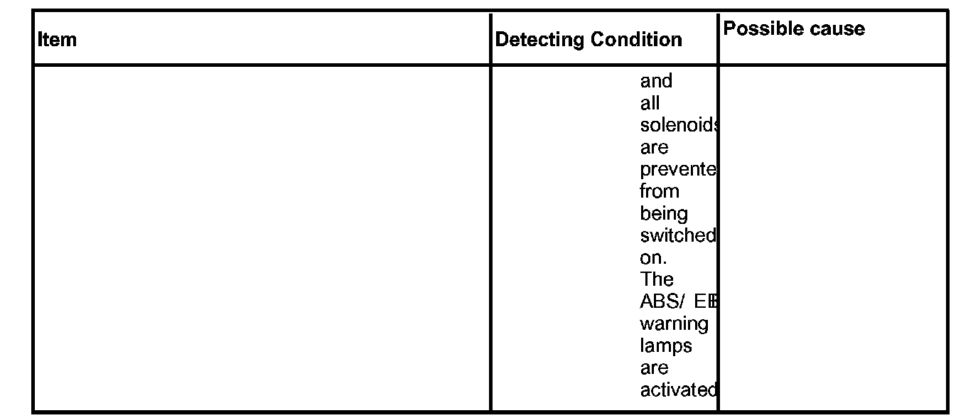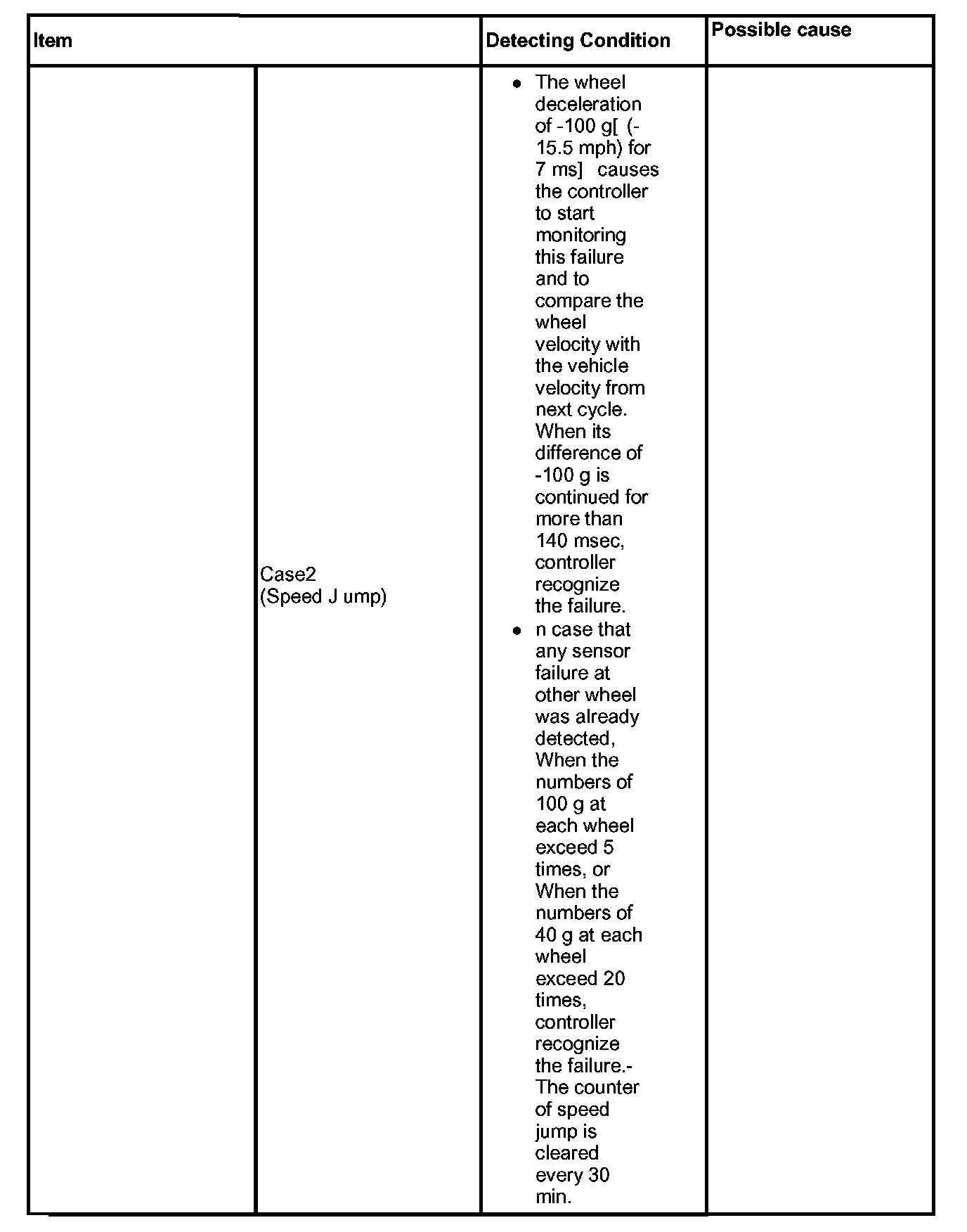 The ABS ECU monitors the wheel speed sensor signal continuously. This code is set if an abnormal speed change ratio is detected while the vehicle speed is more than 1.24 mph. Warning lamp is turned OFF if the detected fault is not more than when the IG KEY is turned to ON again, and wheel speeds are more than 6.21 mph.