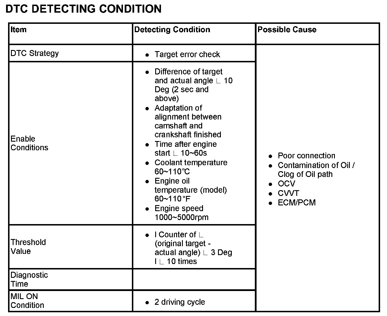 If "Counter of (original target - actual angle) 3 Deg" is over 10 times under enable conditions, ECM/PCM sets DTC P0012.