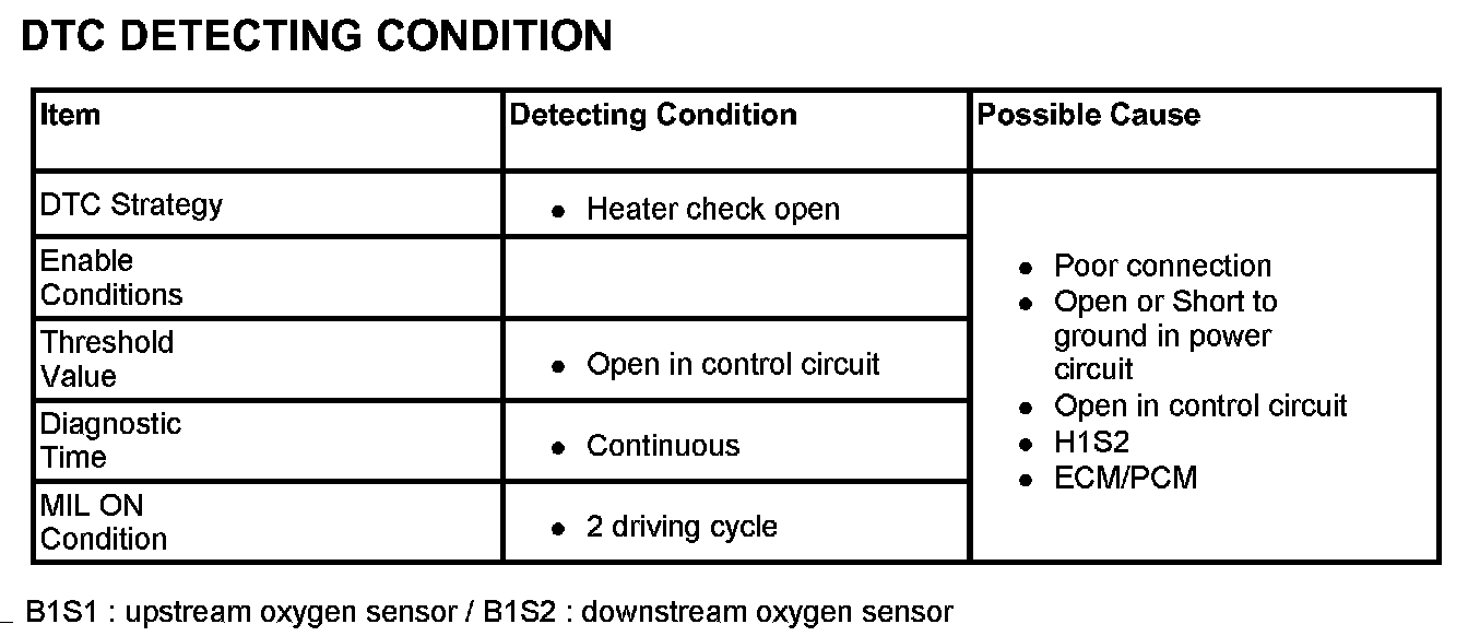 When ECM/PCM detects the open in the heater control circuit(B1S2), ECM/PCM sets DTC P0036.