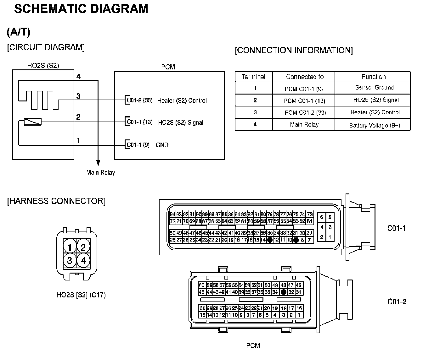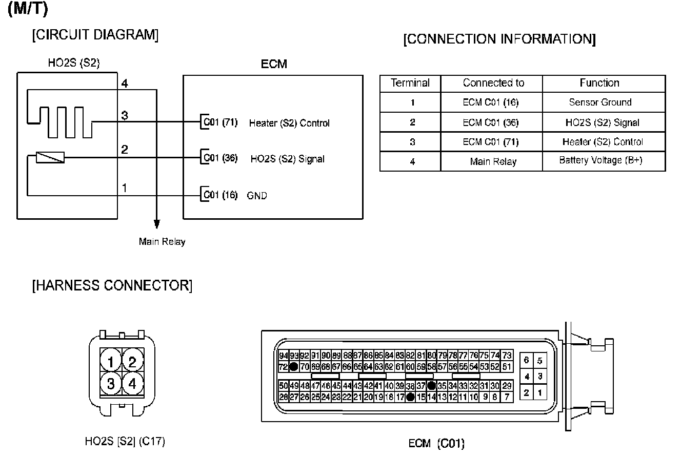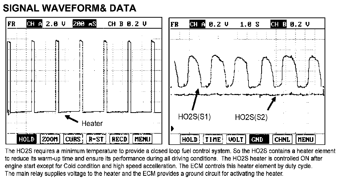 In order to control emissions of the CO, HC and NOx components of the exhaust gas, heated oxygen (HO2S), mounted on the front side and rear side of catalytic converter, detects the oxygen content in the exhaust gas. The front HO2S signal is used to control air/fuel ratio (closed loop fuel control) and the rear HO2S signal is used to monitor front HO2S and catalyst for proper operation.The HO2S requires a minimum temperature to operate properly and provide a closed loop fuel control system. The HO2S contains the element to reduce its warming-up time and ensure its performance during all driving conditions.The ECM/ controls this heater element by duty cycle. The main relay supplies voltage to the heater and the ECM/ provides a ground circuit for activating the heater.