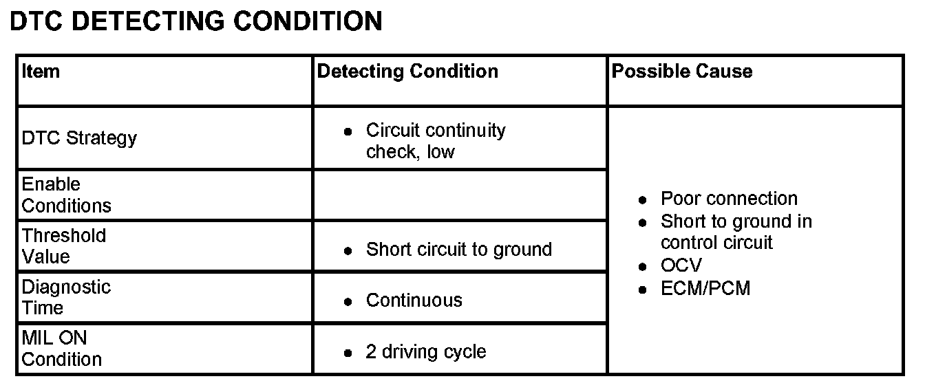 When ECM/PCM detects short to ground in OCV control circuit, ECM/PCM sets DTC P0076.