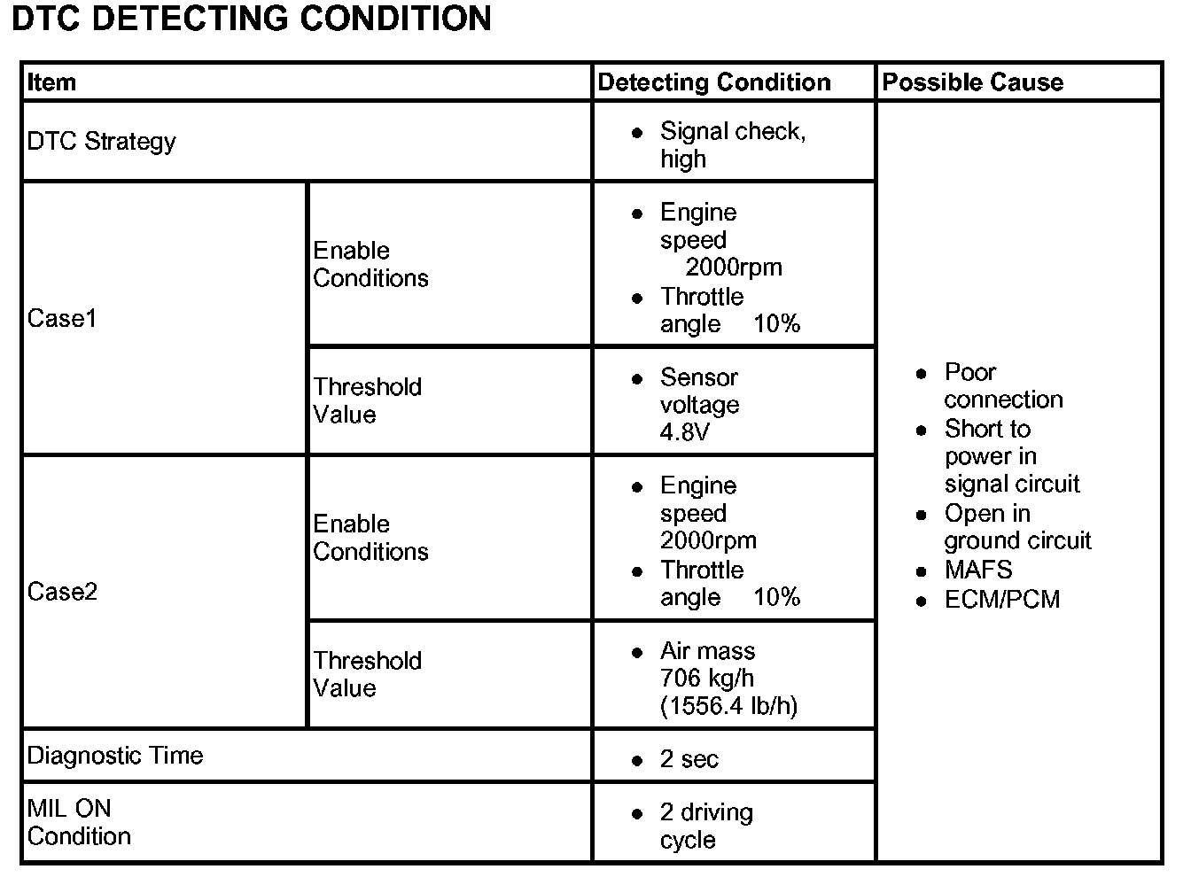 If signal output voltage or intake air mass is more than the maximum threshold value under specified conditions, ECM/PCM sets P0103.