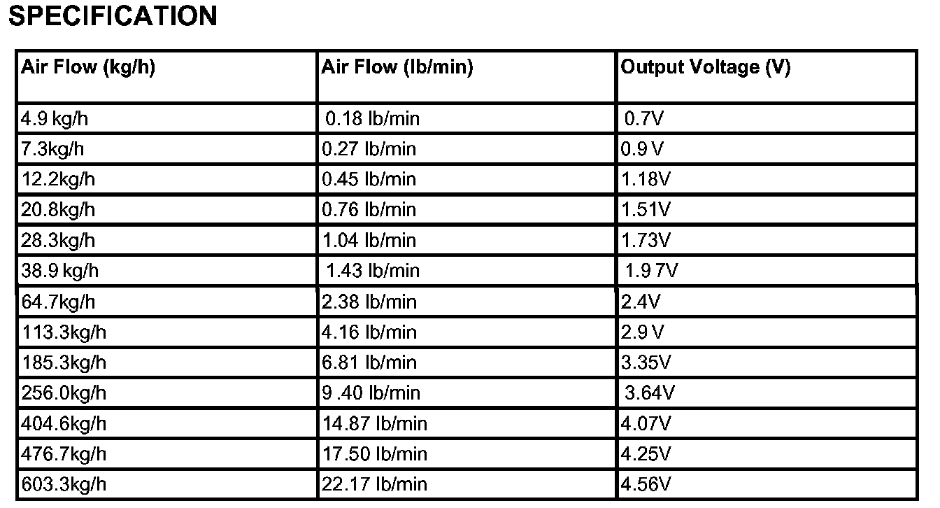 MAF Sensor is an air mass flowmeter, which operates on the principle of hot film anemometry. A heated element is placed within the air stream, and maintained at a constant temperature above the air temperature. The amount of electrical power required to maintain the heated element at the proper temperature is a direct function of the flow rate of the air mass past the element. ECM/PCM uses this information to determine the injection duration and ignition timing for the desired air/fuel ratio.