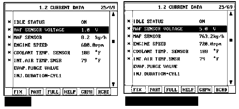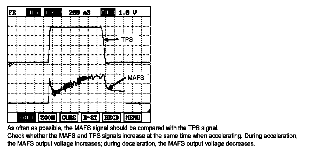 d. Measure signal waveform of MAFS and TPS together by stepping on and off the accelerator pedal.