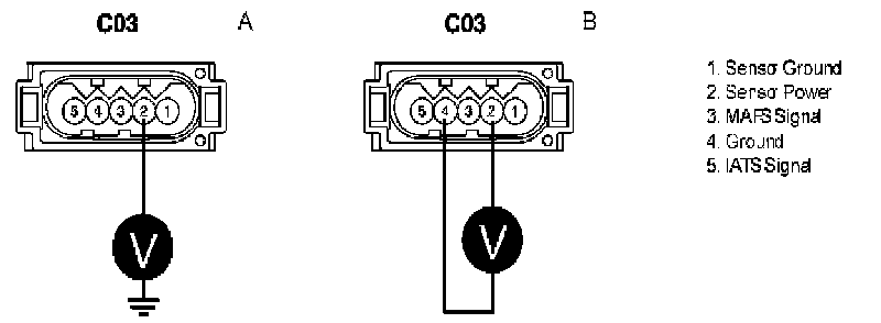 e. Measure voltage between terminal 1 and 2 of MAFS harness connector.(B)