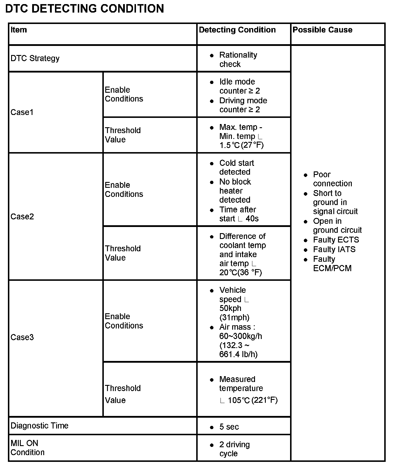 If measured temperature is satisfied with threshold value during 10 sec, ECM/PCM sets DTC P0111.
