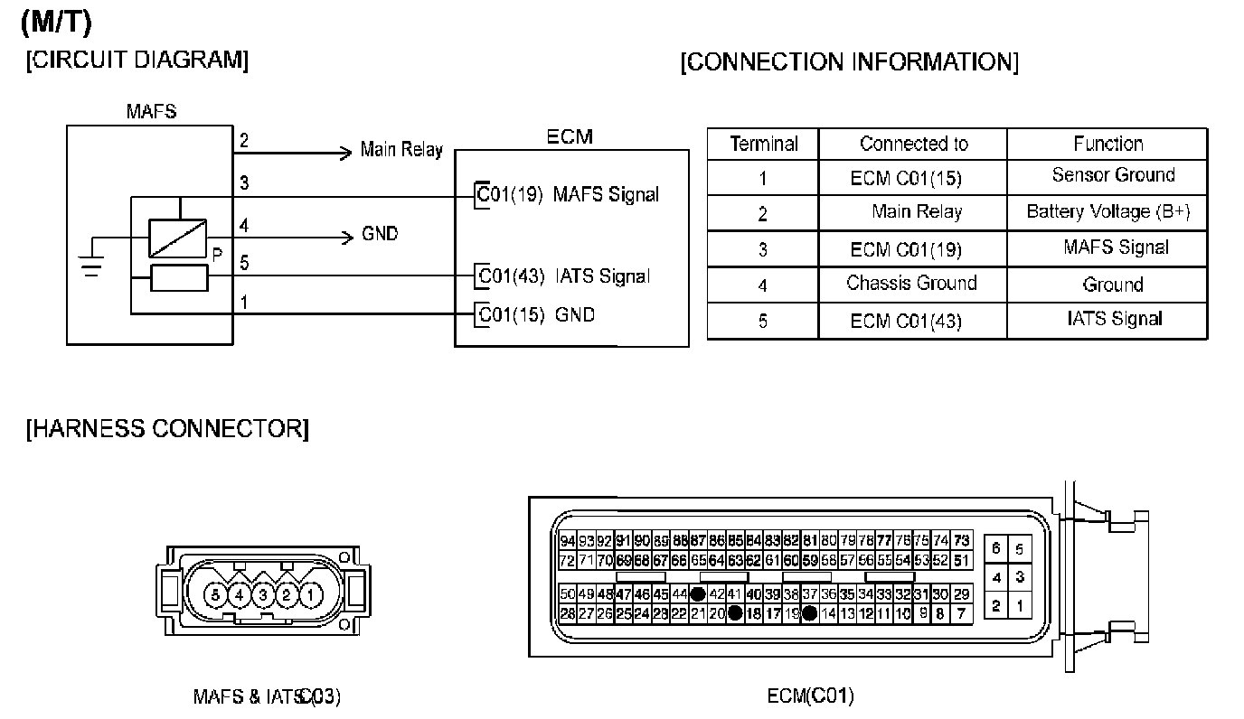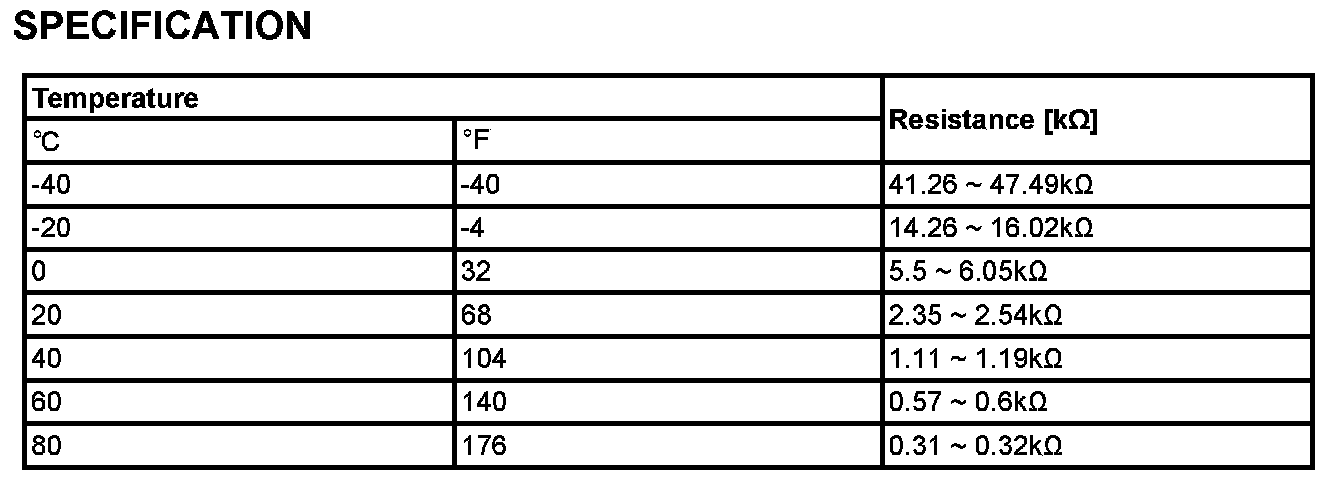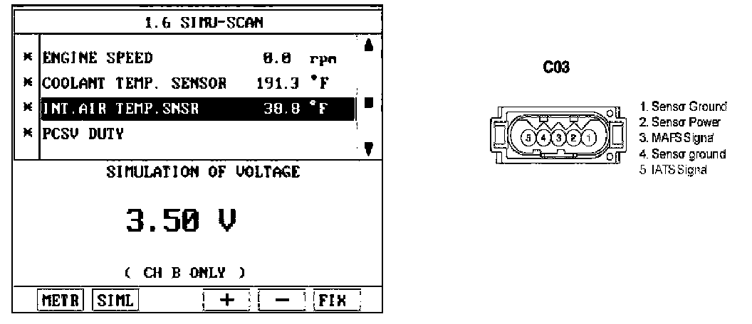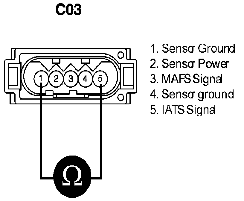 The Intake Air Temperature (IAT) sensor measures the temperature of engine intake air. The Intake Air Temperature (IAT) sensor is a thermistor (a variable resistor that changes along with outside air temperature) in series with a fixed resistor in the ECM/PCM. The ECM/PCM applies 5 V to the IAT sensor. The ECM/PCM monitors the voltage across the IAT sensor and converts it into a temperature reading. When the outside air temperature is cold the IAT sensor resistance is high, and when the outside air temperature is warm the IAT sensor resistance is low. Therefore, when the air temperature is cold the ECM/PCM will receive a high voltage input, and when the air temperature is warm the ECM/PCM will receive a low voltage input. The signal from IAT sensor is used for injection duration correction, ignition timing correction and idle speed correction (Air density correction).