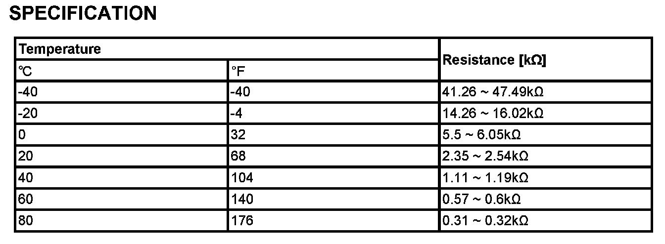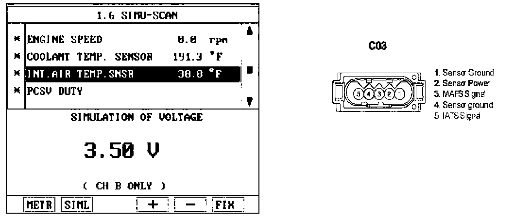 The Intake Air Temperature (IAT) sensor measures the temperature of engine intake air. The Intake Air Temperature (IAT) sensor is a thermistor (a variable resistor that changes along with outside air temperature) in series with a fixed resistor in the ECM/PCM. The ECM/PCM applies 5 V to the IAT sensor. The ECM/PCM monitors the voltage across the IAT sensor and converts it into a temperature reading. When the outside air temperature is cold the IAT sensor resistance is high, and when the outside air temperature is warm the IAT sensor resistance is low. Therefore, when the air temperature is cold the ECM/PCM will receive a high voltage input, and when the air temperature is warm the ECM/PCM will receive a low voltage input. The signal from IAT sensor is used for injection duration correction, ignition timing correction and idle speed correction (Air density correction).