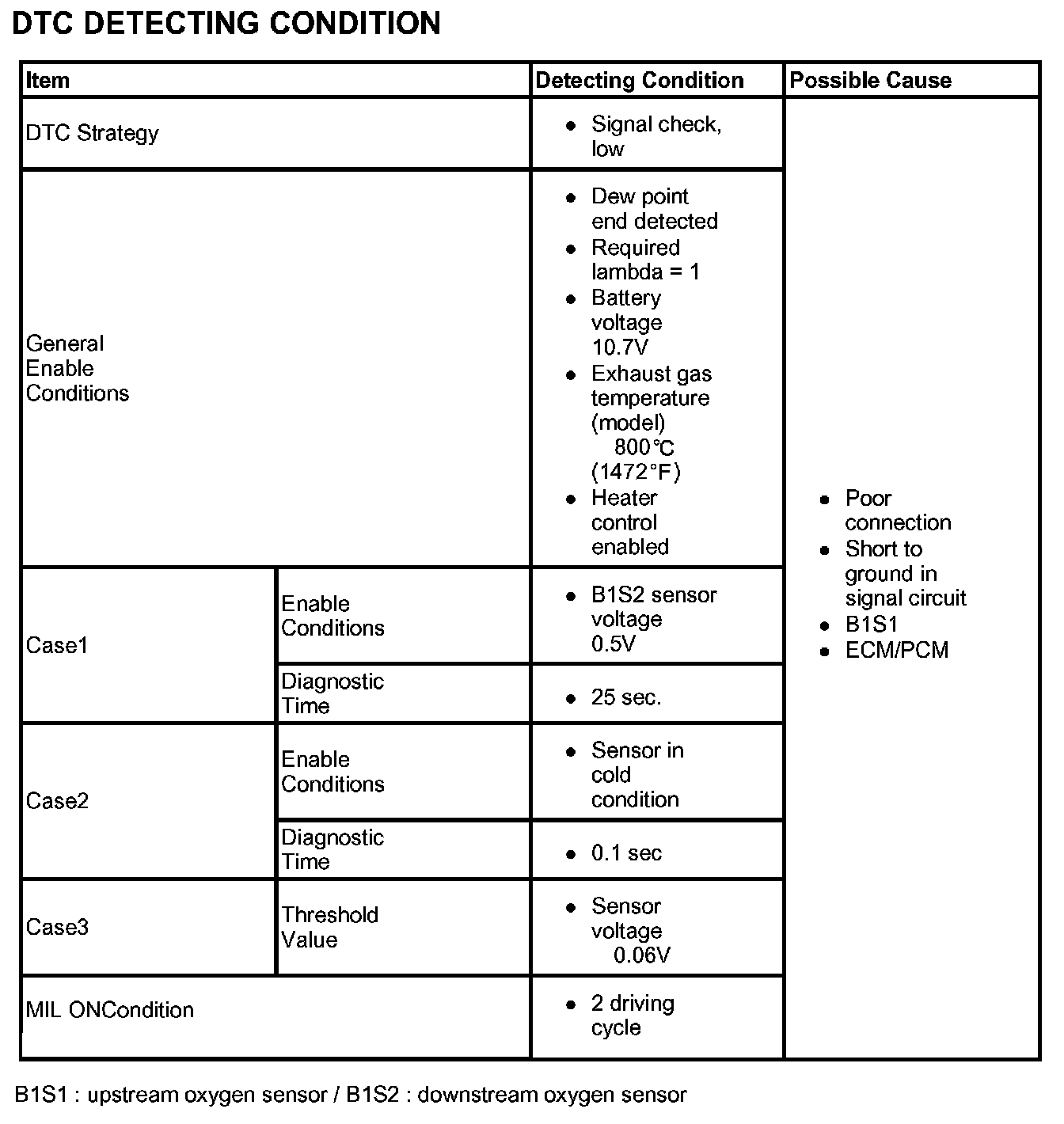 If the sensor output is below 0.06 V under enable conditions, ECM/PCM sets DTC P0131.(This DTC might be caused by the malfunction of Heater circuit, so, check the heater circuit first.)