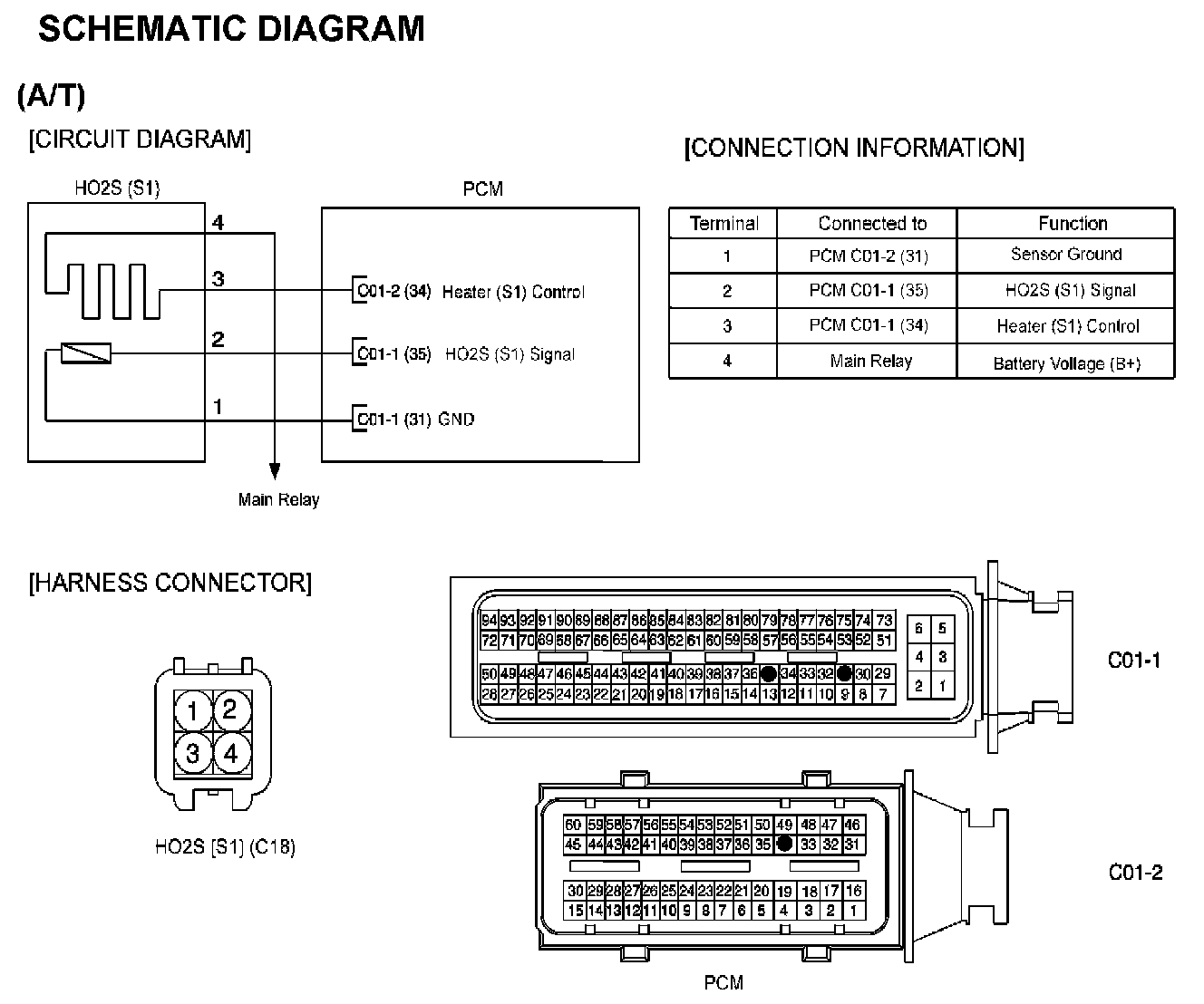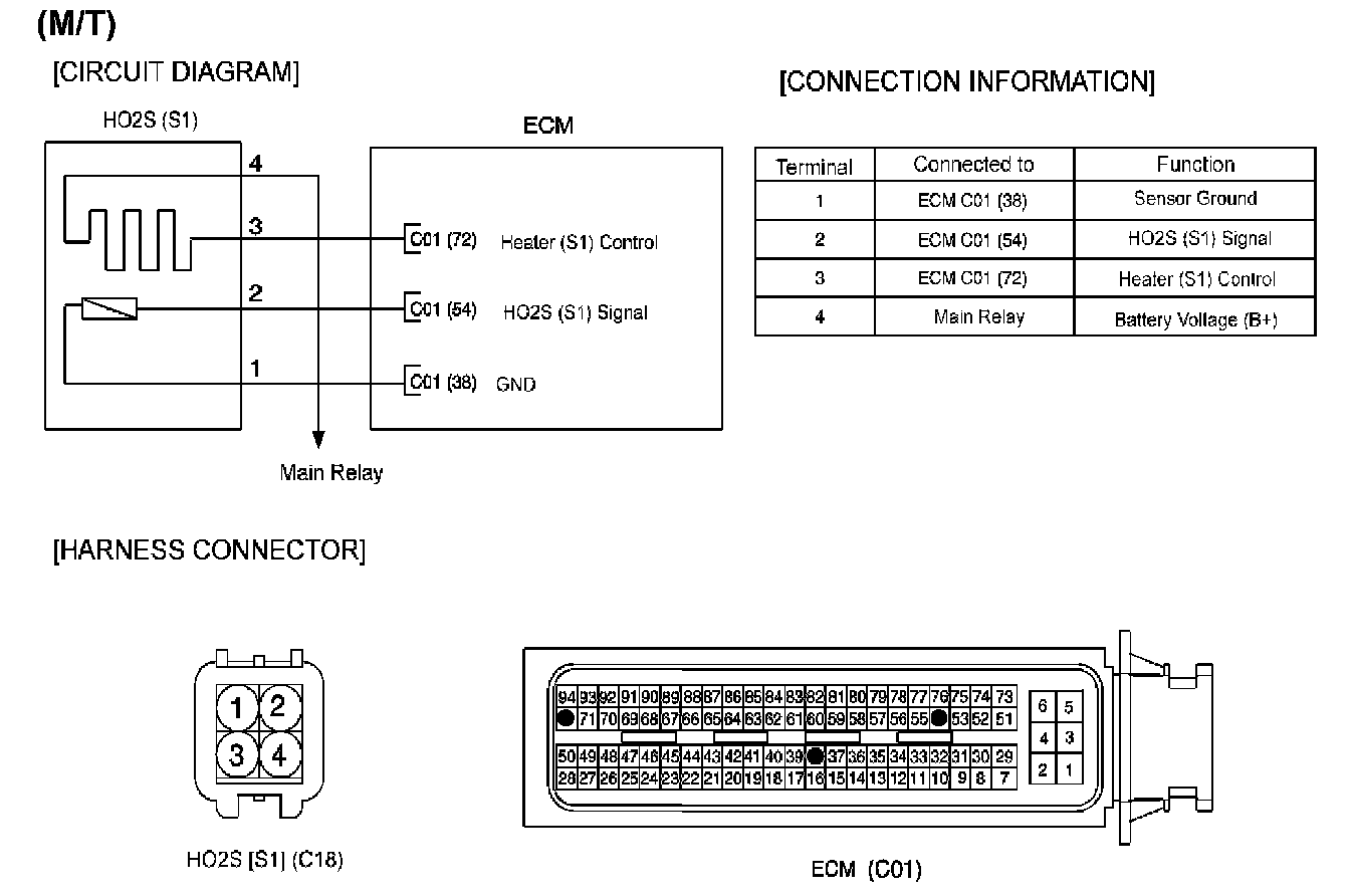 The heated oxygen sensors are mounted on the front side and the rear side of Catalytic Converter (warm-up catalytic converter), which detects the oxygen concentration in the exhaust gas. The front HO2S signal is used to control air/fuel ratio (closed loop fuel control) and the rear HO2S signal is used to monitor front HO2S and catalyst for proper operation. The heated oxygen sensor (HO2S) produces a voltage that varies between 0 V and 1 V. When the air/fuel ratio is lean, the oxygen concentration in the exhaust gas increases and the front HO2S outputs a low voltage (approximately 0 - 0.4 V).When the air/fuel ratio is rich, the oxygen concentration in the exhaust gas decreases and the front HO2S outputs a high voltage (approximately 0.8 - 0.6 V). The ECM/PCM constantly monitors the HO2S and increases or decreases the fuel injection duration by using the HO2S signal, which is called closed-loop fuel control operation.