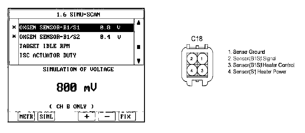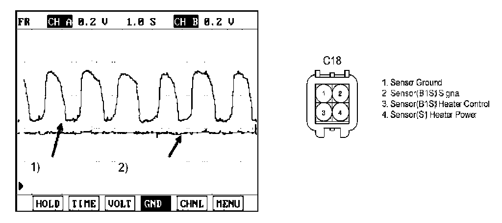 b. Connect probe to terminal 2 of HO2S(B1/S1) connector and select oscilloscope function with scantool.