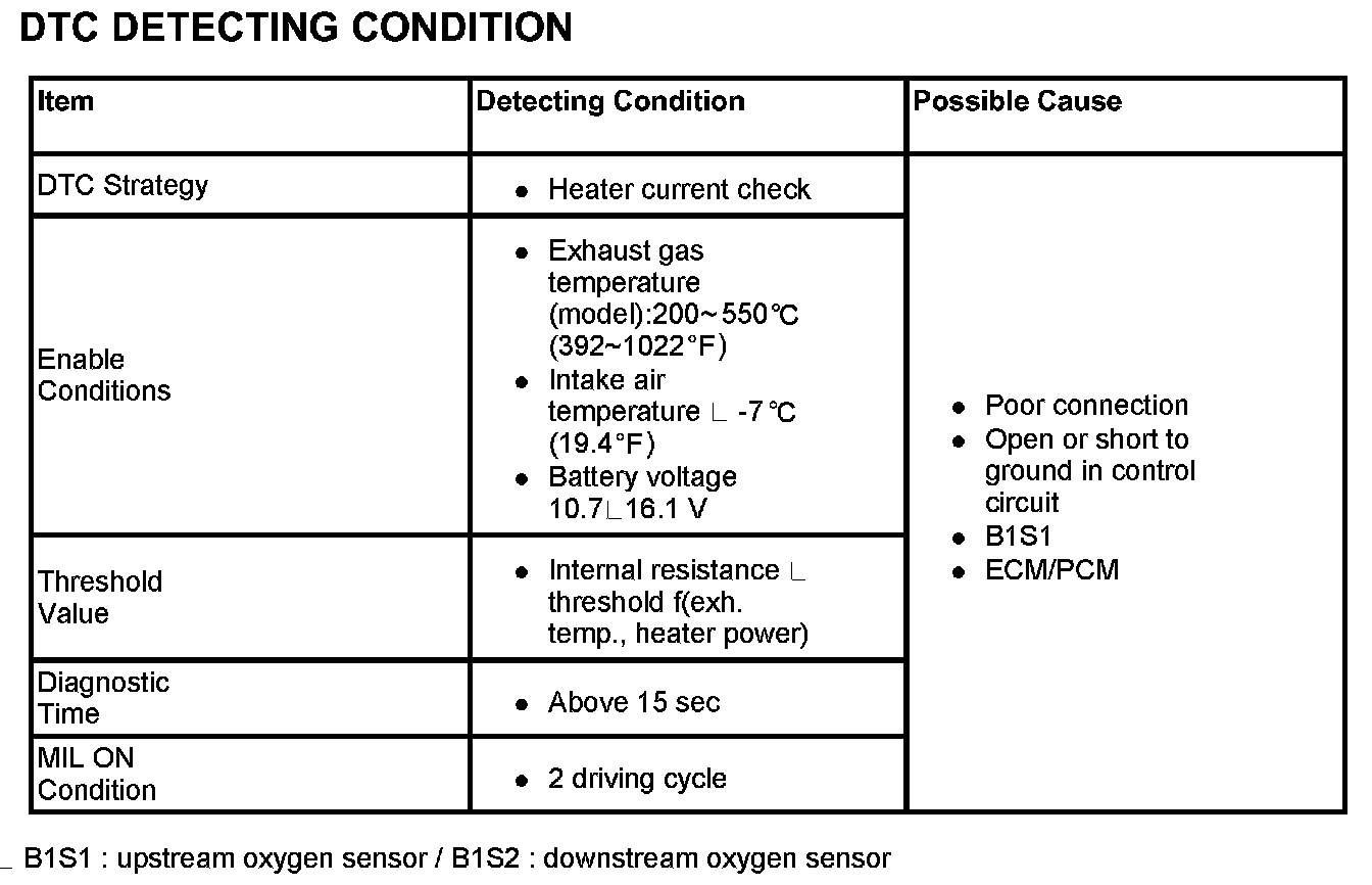 If ECM/PCM detects that the internal resistance of heater is out of threshold value, ECM/PCM sets DTC P0135.