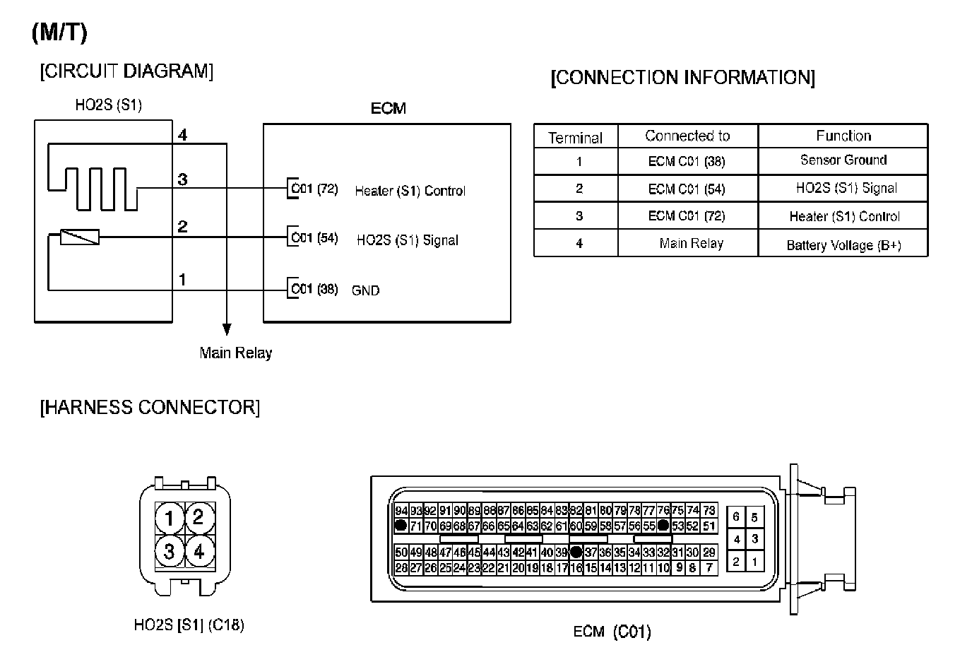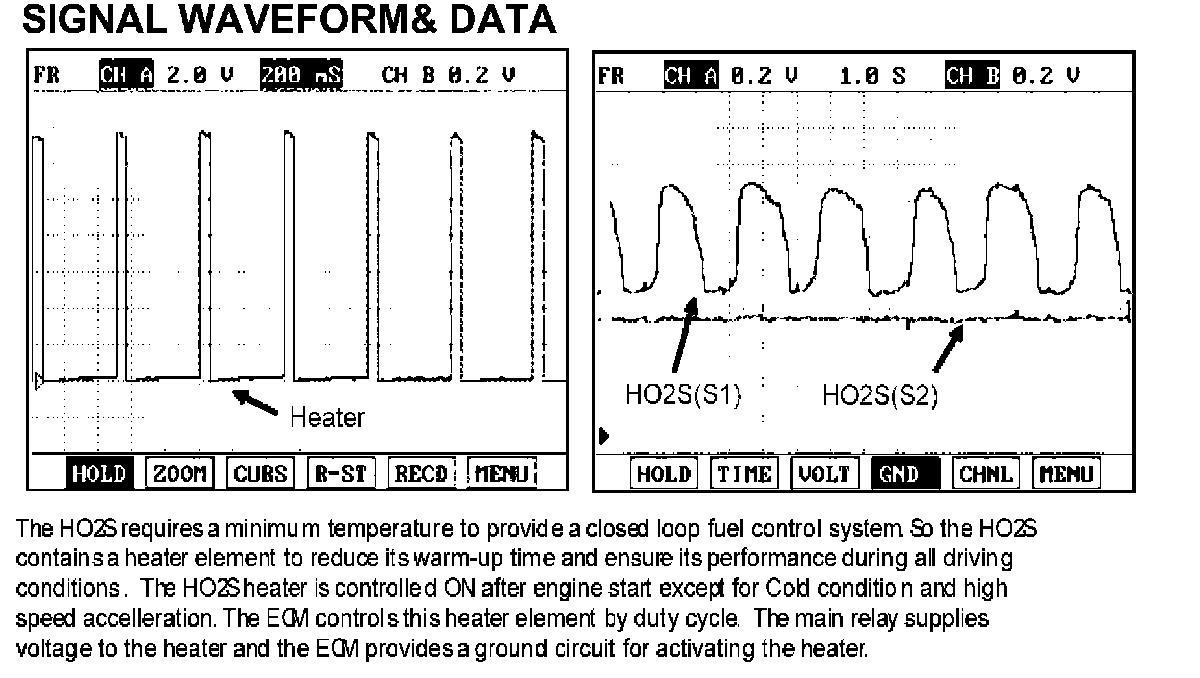 The heated oxygen sensors are mounted on the front side and the rear side of Catalytic Converter (warm-up catalytic converter), which detects the oxygen concentration in the exhaust gas. The front HO2S signal is used to control air/fuel ratio (closed loop fuel control) and the rear HO2S signal is used to monitor front HO2S and catalyst for proper operation. The heated oxygen sensor (HO2S) produces a voltage that varies between 0 V and 1 V. When the air/fuel ratio is lean, the oxygen concentration in the exhaust gas increases and the front HO2S outputs a low voltage (approximately 0 - 0.4 V).When the air/fuel ratio is rich, the oxygen concentration in the exhaust gas decreases and the front HO2S outputs a high voltage (approximately 0.6 - 1 V). The ECM/PCM constantly monitors the HO2S and increases or decreases the fuel injection duration by using the HO2S signal, which is called closed-loop fuel control operation.